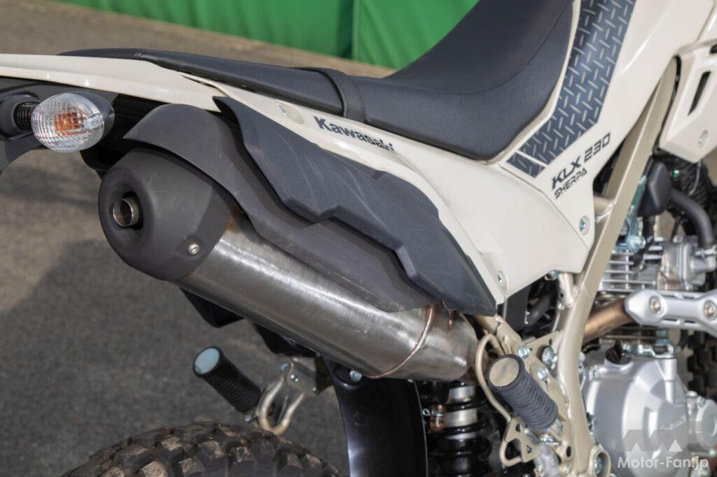 右サイドアップマフラーを採用。マットブラックの樹脂製カバーも装備されている。