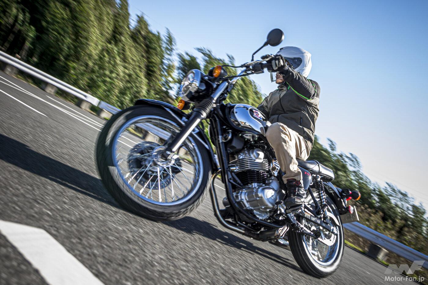 あえてエストレアの記憶と比較すると、よりリズミカルで快活、弾けるような歯切れの良い連続音が印象的で、吹き上がりのシャープさもなかなかのレベル。レスポンスの俊敏さという意味ではKLXとは明確に異なり、少しドロドロと重さを伴うフィーリングだった。低回転域から頼れるトルクが柔軟に発揮され発進操作やシフトワーク、渋滞路でのノロノロ走行も含めてとても扱いやすい。
