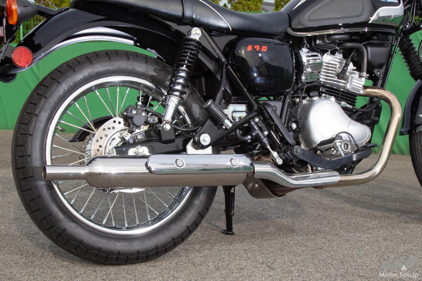 足回りは前18後17インチのスポークホイールにIRC製タイヤを装着。テレスコピック式フロントフォークにはラバーブーツを装備。リアは長円形断面のスチール製スイングアームを採用した2本ショックサスペンションで、ショックにはダブルピッチスプリングを使用。ブレーキは前後ともにシングルディスクを装備。前は2ピストン後は1ピストンのピンスライド式油圧キャリパーを備えている。