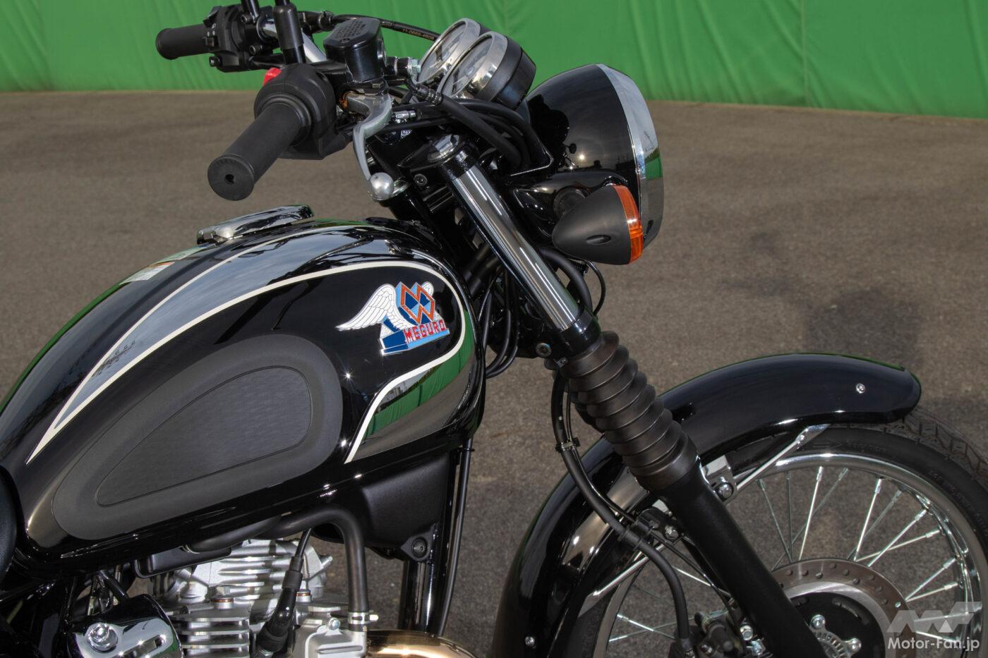 搭載エンジンは232ccの空冷単気筒。広報資料によると60年前に存在したカワサキ250メグロSG からの系譜を受け継いだメグロの正統な後継モデルという。解説文の一部を引用すると“立体的な「MEGURO」エンブレムが100年の歴史とスタイルを受け継ぐレトロクラシックモデル、メグロであることを示しています。”と記されていた。