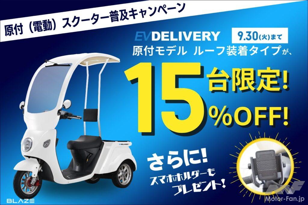 株式会社ブレイズ(愛知県名古屋市)は、2025年8月25日より「原付(電動)スクーター普及キャンペーン」を開始した。対象となる「EVデリバリー」原付登録モデル(ルーフ装着、ホワイト)は、通常価格64万6800円のところ15%オフで54万9780円(税込)で提供されるほか、購入者全員にスマホホルダーをプレゼント。家庭用コンセントで充電可能な電動原付は、燃料費やメンテナンスコストの削減に優れ、都市部での配達用途にも適する。期間は9月30日まで、台数限定のため早期売り切れが予想される。