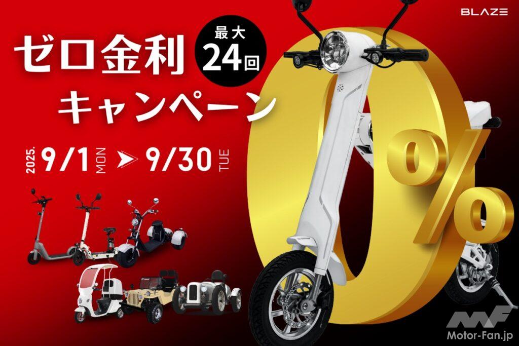株式会社ブレイズ(名古屋市)は、2025年9月1日から9月30日まで、同社の電動モビリティ購入に際し、最大24回までのショッピングローン手数料を全額負担する「ゼロ金利キャンペーン」を実施する。これにより、特定原付バイクから電動キックボード、EVトライク、ミニカー、クラシックカーまで幅広いラインナップが、月々4900円台から購入可能となる(一部車種を除く)。ローン利用には審査が必要で、購入は同社公式ECサイト限定となる。キャンペーン内容は予告なく変更・終了する場合があるので注意が必要だ。