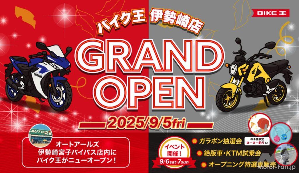 株式会社バイク王&カンパニーは、2025年9月5日、群馬県伊勢崎市に新店舗「バイク王 伊勢崎店」をオープンする。カー用品店オートアールズ宮古バイパス店内に立地し、関東圏からのアクセスに優れ、買取・販売・整備・点検などバイクライフを総合サポートする拠点となる。オープン記念イベントとして9月6日・7日の2日間、豪華景品が当たる抽選会や小学生以下を対象とした水風船ヨーヨー釣りを実施。さらに期間限定で50ccクラス車を9万9000円、51~250ccクラスを19万9000円で提供する特選車販売も予定されている。地域ライダーやファミリー層にも訪れやすい新店舗として期待される。