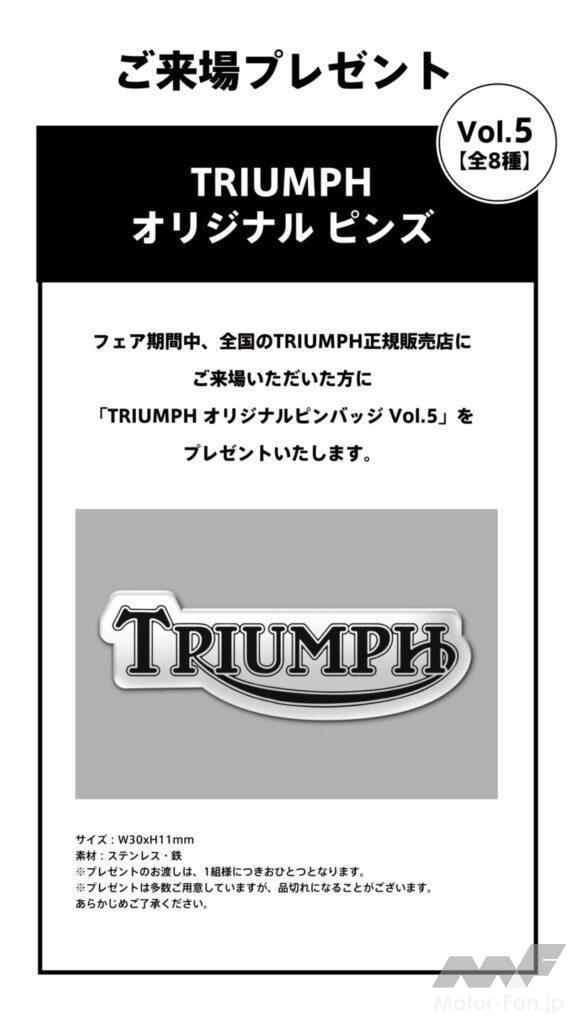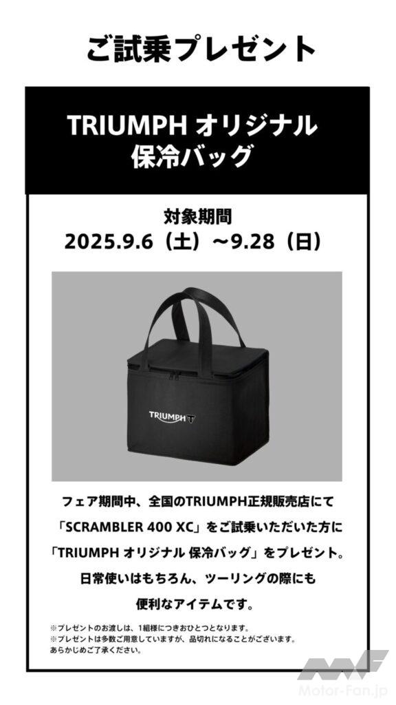 トライアンフモーターサイクルズジャパンは、2025年9月6日から28日まで全国の正規販売店にて「SCRAMBLER 400 XC デビューフェア」を開催する。来場者には「TRIUMPH オリジナルピンバッジ Vol.5」をプレゼントし、試乗者には「TRIUMPH オリジナル保冷バッグ」を贈呈(いずれも数量限定) 。新型SCRAMBLER 400 XCは、街中の視線を集めるタフなデザインと、強力な低速トルクを備えたレスポンスに優れたエンジンを搭載。スポークホイールとチューブレスタイヤによる優れた操作性や快適性も注目ポイントだ 。モダンな機能として切替式トラクションコントロールと、アナログ+LCD表示のメーターも装備されている。