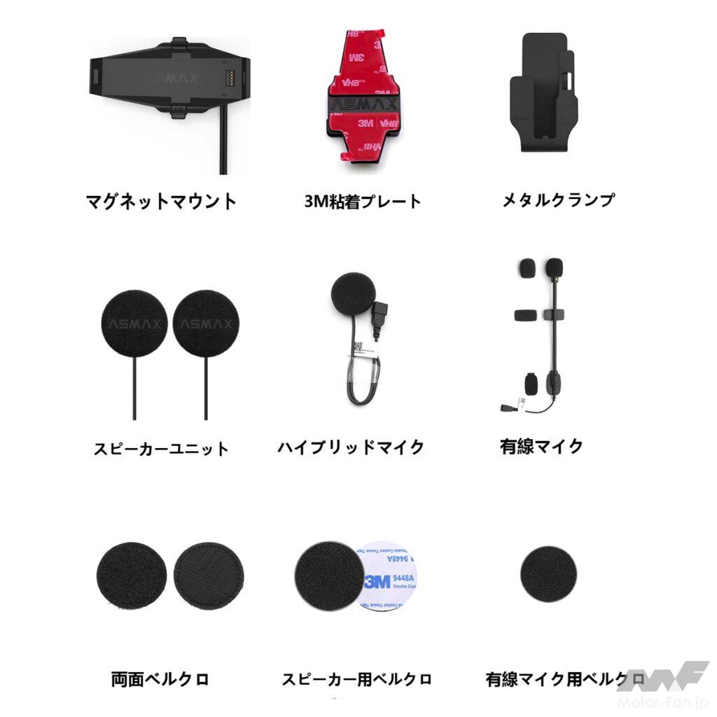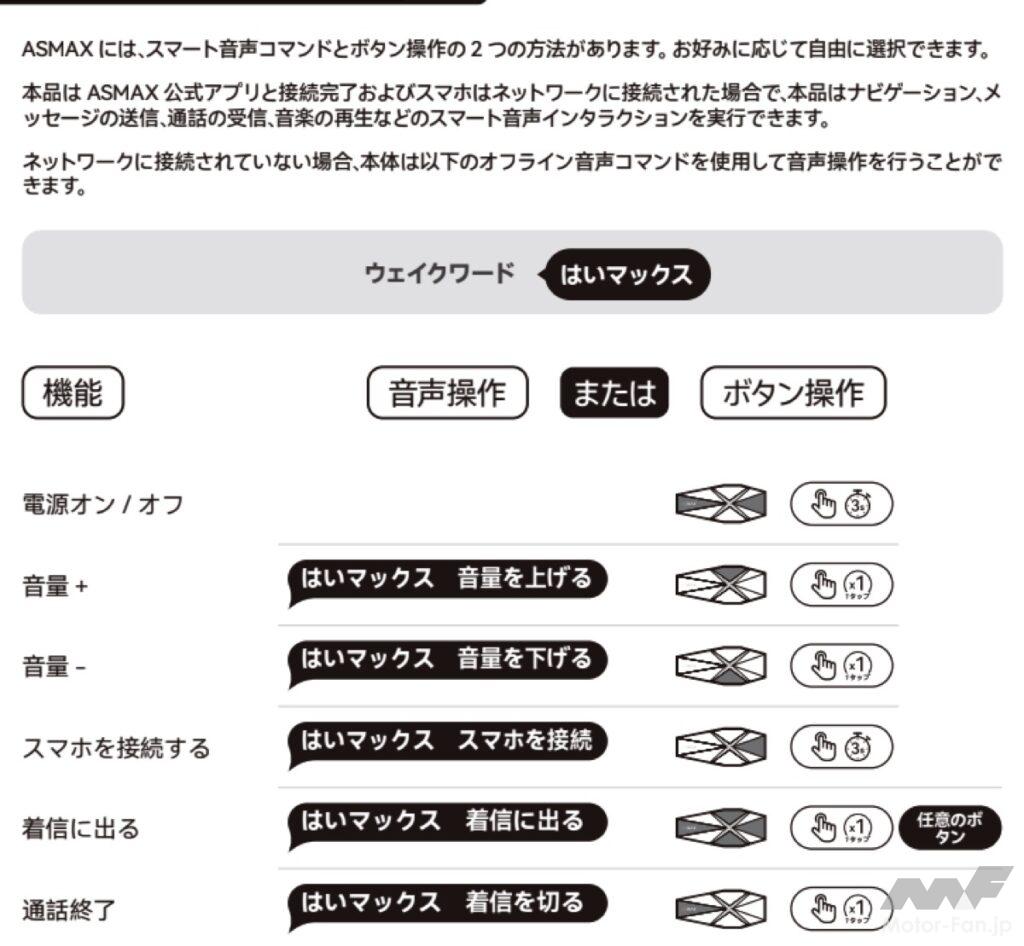 日本モデルの主な機能は、Bluetooth 5.3デュアルチップ(8コア)、通信距離500m~最大3km、10人同時ペアリング(将来的に16人に拡張予定)、音声コマンド「Hi MAX」、ENCノイズリダクション、選べるマイク(ブーム型/有線型)、ASMAXオリジナル40mmスピーカー(Bongiovi Acoustic Labsチューン)、操作は物理ボタン・音声・専用アプリ「ASMAX WORLD」、マグネット式取付、1350 mAhバッテリー(連続通話約14時間、急速充電対応)、IPX7防水、2年保証、OTAアップデート、他社インカムとのユニバーサルペアリング。