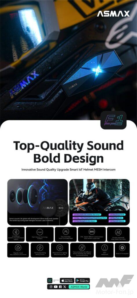 株式会社カスタムジャパンが次世代バイク用インカムブランド「ASMAX(アズマックス)」より、最新フラッグシップモデル「F1 Pro(エフワン・プロ)」を2025年9月上旬から正規輸入品として独占販売する。ASMAX F1 Proはメッシュ通信、高音質スピーカー、音声操作、IPX7防水、専用アプリ対応など、ハイエンドモデルに求められる機能を網羅しながら、市場価格の“半額水準”を実現し、ライダーにとって「迷ったらこれを選べば間違いない」と言える次世代インカムの決定版として位置付けられる。