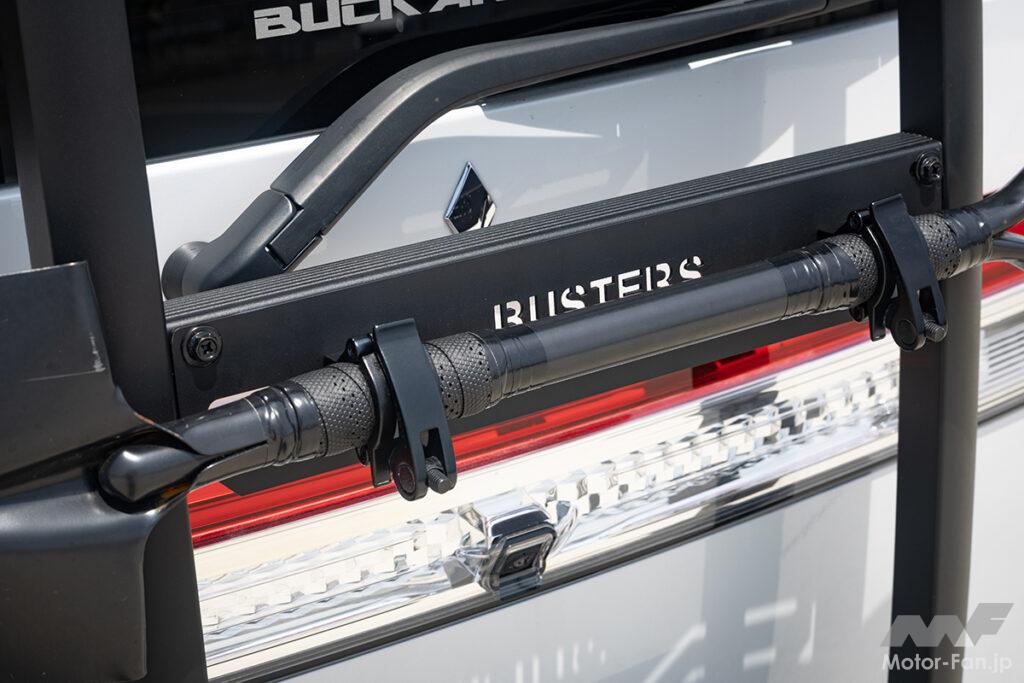 デモカーには、さらにD:5乗りをザワつかせる魅力的なパーツが装着済み。例えば、リアラダーは、ルーフラックへの荷物を乗せる際に便利だし、その機能美あふれるルックスも4駆感の演出に効果的だ。さらに、新作としてラダー中央部に装着するアクセサリーブラケットもドロップ。また、ゴクブトRに装着するデイライトは新作、バスターズ ルーフラックに装着される40インチLEDは開発中とライティングパーツにも力を入れている。