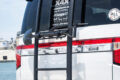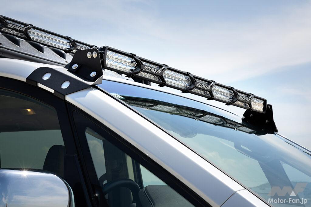 デモカーには、さらにD:5乗りをザワつかせる魅力的なパーツが装着済み。例えば、リアラダーは、ルーフラックへの荷物を乗せる際に便利だし、その機能美あふれるルックスも4駆感の演出に効果的だ。さらに、新作としてラダー中央部に装着するアクセサリーブラケットもドロップ。また、ゴクブトRに装着するデイライトは新作、バスターズ ルーフラックに装着される40インチLEDは開発中とライティングパーツにも力を入れている。
