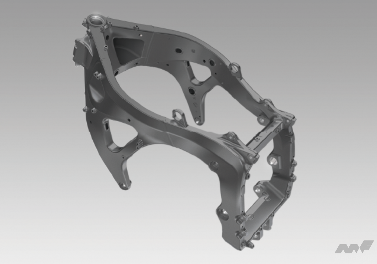 ステアリングヘッドの高強度も徹底追求された中空アルミダイキャスト製ツインチューブフレーム。