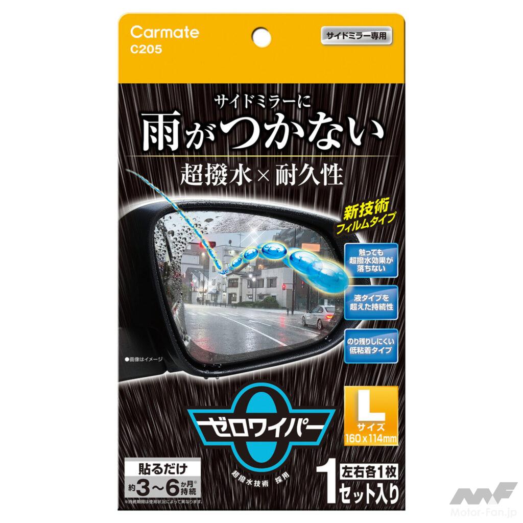 カーメイトの『ゼロワイパー フィルムタイプ サイドミラー用』は、クリアフィルムを鏡面に貼るだけで優れた撥水力を実現。目には見えないフィルム表面の微細な突起が水を寄せ付けず、つねに鮮明な視界を確保できる。触っても、クロスで拭いても撥水性能に影響がなく、約3~6カ月の耐久力を誇る。