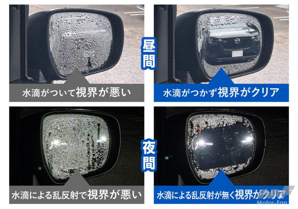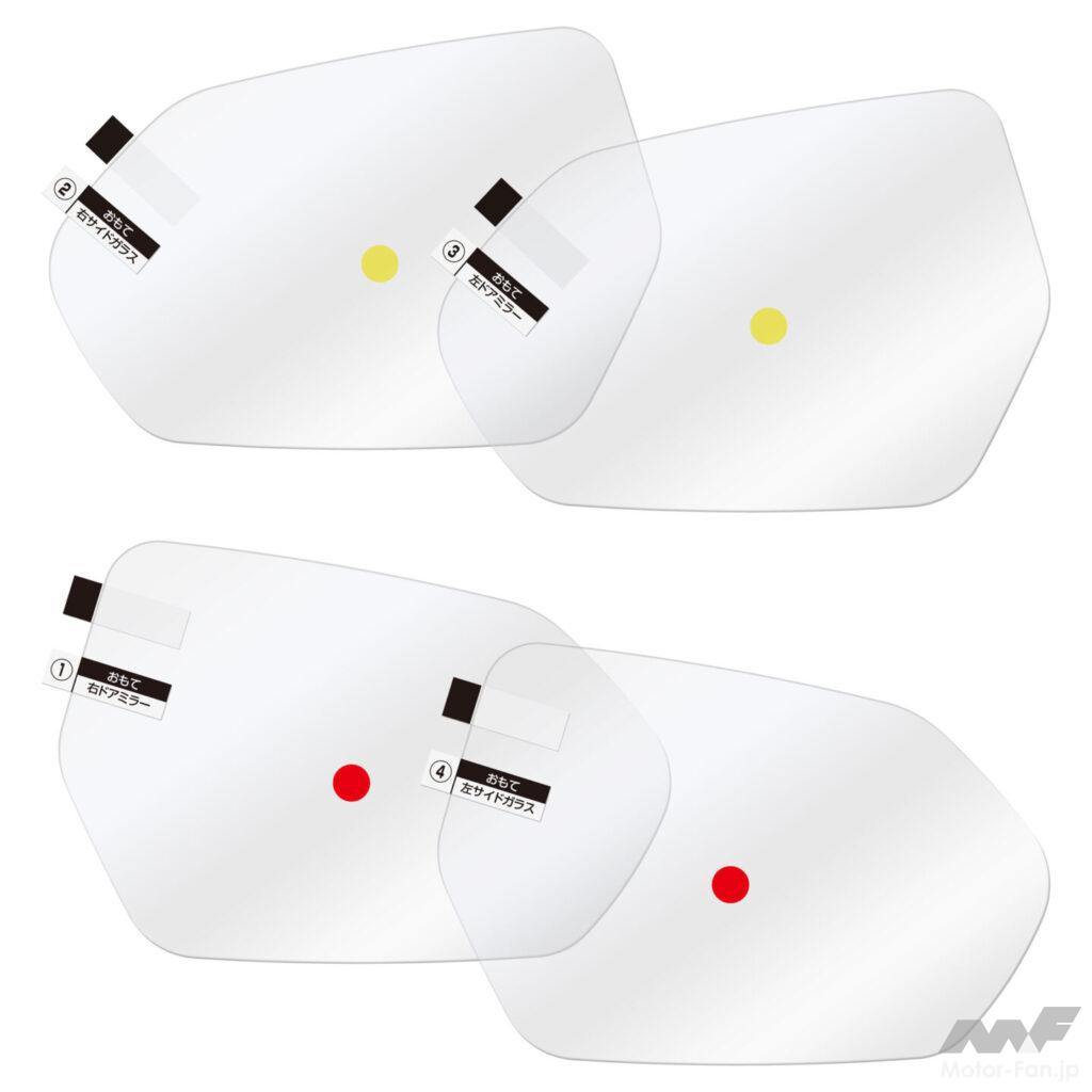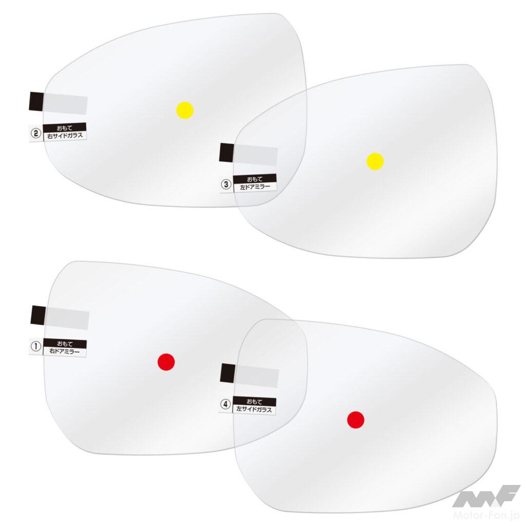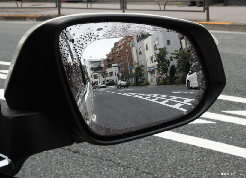 カーメイトの『ゼロワイパー フィルムタイプ サイドミラー用』は、クリアフィルムを鏡面に貼るだけで優れた撥水力を実現。目には見えないフィルム表面の微細な突起が水を寄せ付けず、つねに鮮明な視界を確保できる。触っても、クロスで拭いても撥水性能に影響がなく、約3~6カ月の耐久力を誇る。