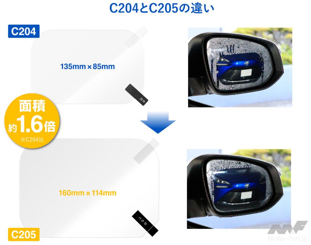 今回登場した『ゼロワイパー フィルムタイプ サイドミラー用 Lサイズ(C205)』は従来品(C204)のサイズを約1.6倍に拡大(160×114mm)。「ミラーに対してフィルムが小さい」というユーザーの声に応えて開発され、ミニバンやSUVなどの大型サイドミラーにマッチする。
