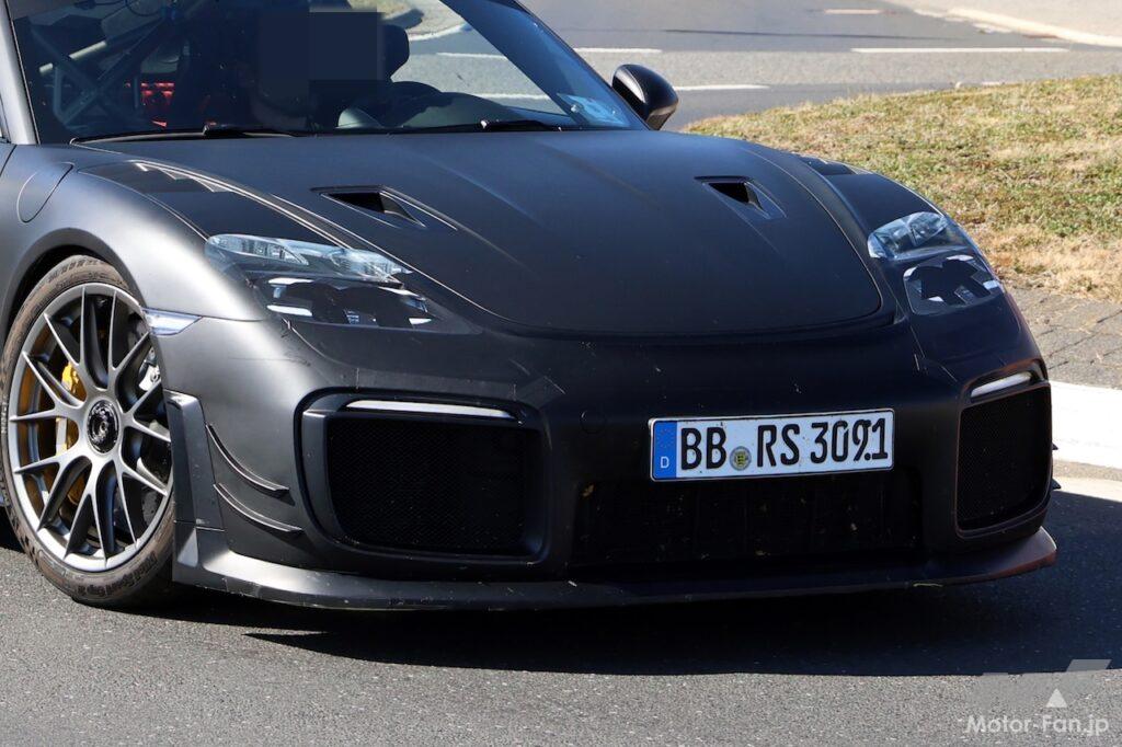 取材班がニュル付近で捉えた開発車両は、現代のスラントノーズと911 GT2 RSのマンタイキットを組み合わせたようなデザインが見てとれる。