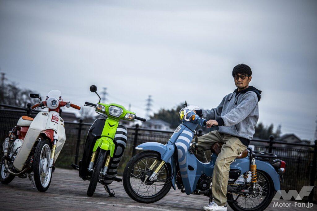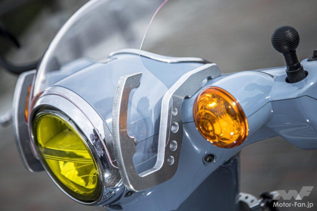 このJA44は2019年に限定発売されたスーパーカブ110・ストリートをベースにしている。ボディとレッグシールドを同色に塗装しつつサイドカバーやリヤキャリア、前後ハブなどをブラック塗装としていたことが特徴。カイキチさんのボニーブルーのほか、ハーベストベージュの2色が設定されていた。このマシンを譲り受けて考えたのは、前2車で施した自家塗装をせずストリートの個性を生かすこと。そこでボディカラーを変えることなく、前2車と同じように円弧を加えて外観を整えた。