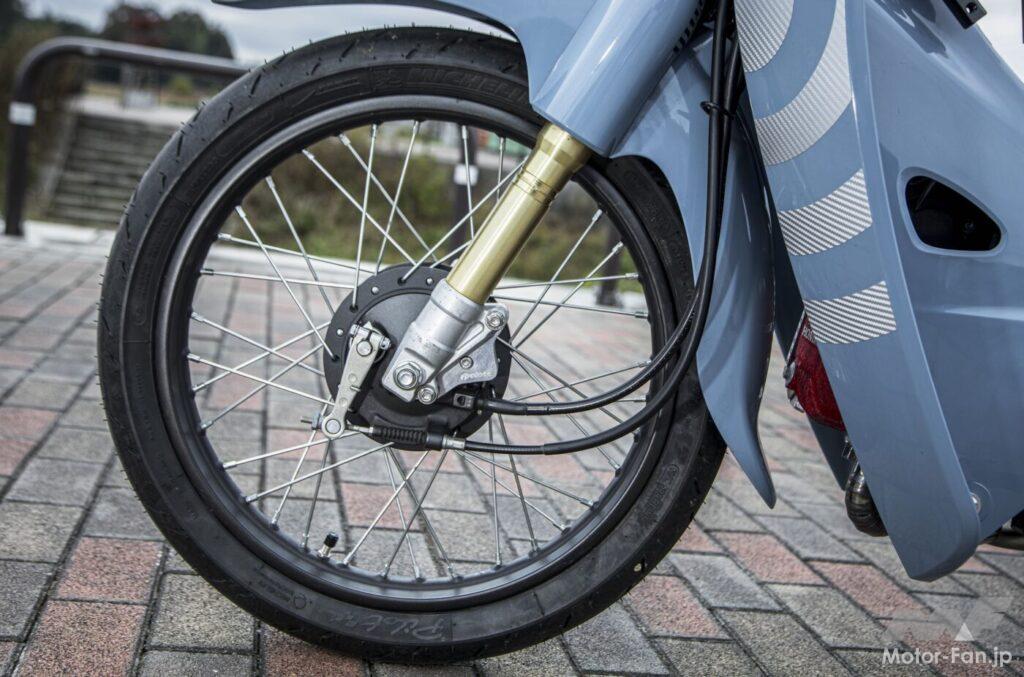 ストリートはハブをブラックに塗装していることも特徴。そこでフロントフォークをDio用にしつつ純正ハブやホイールを生かすため、パネルストッパーを自作して組み合わせている。フォーク裏に付いているのがそれで、実に芸が細かい。さらにホイールリムはJA44純正ではなくクロスカブの純正を用いている。こうすることでJA44よりワイドなタイヤを装着することができるのだ。