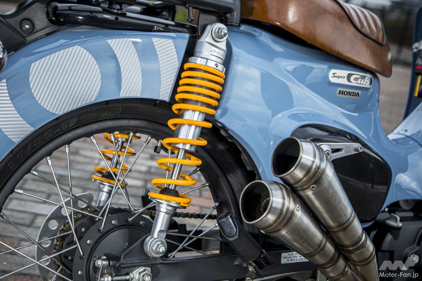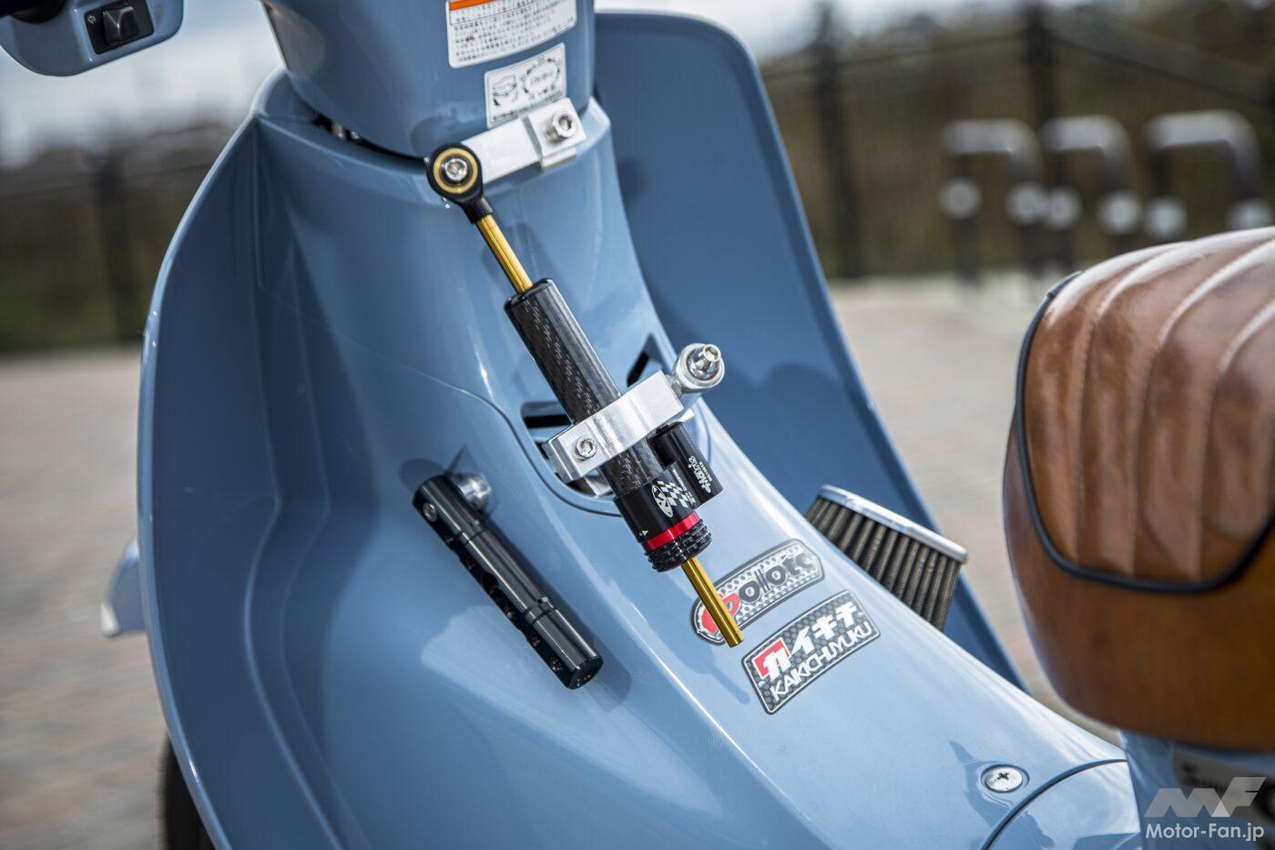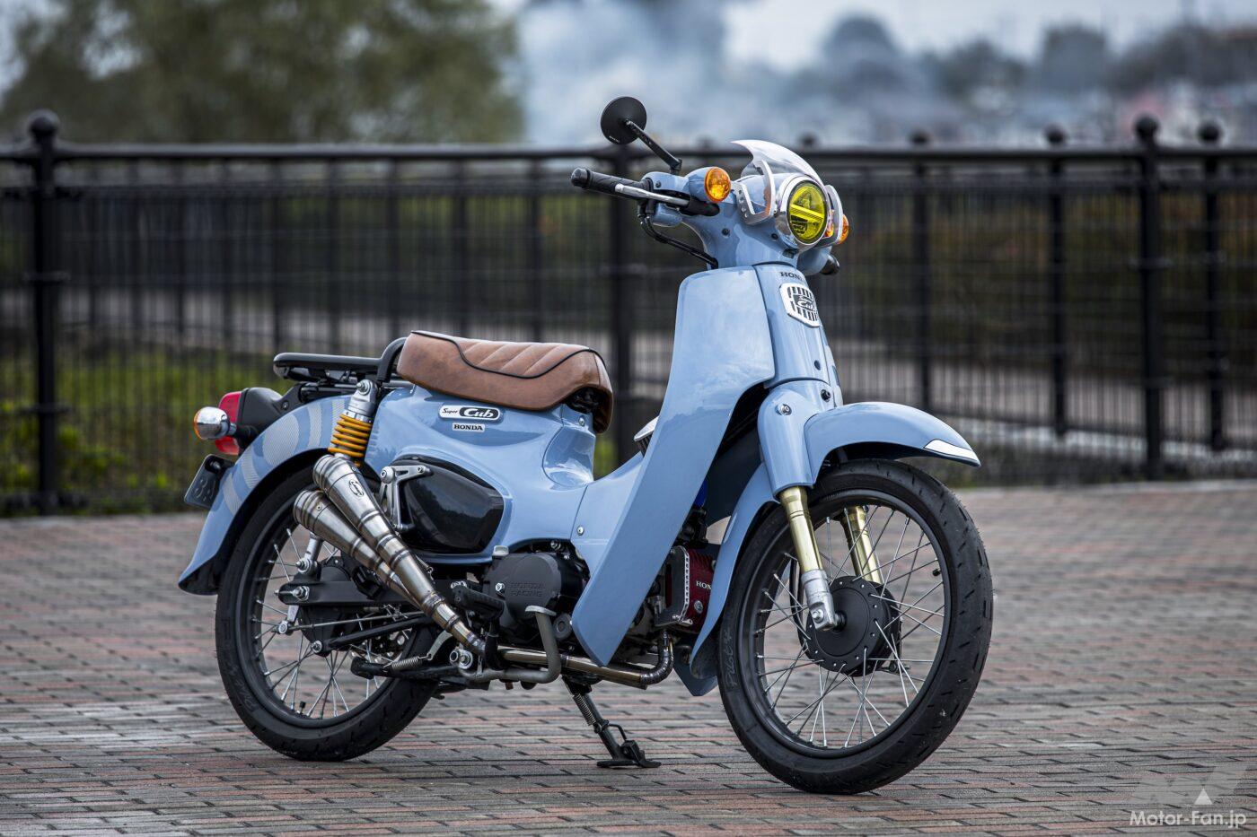 このJA44は2019年に限定発売されたスーパーカブ110・ストリートをベースにしている。ボディとレッグシールドを同色に塗装しつつサイドカバーやリヤキャリア、前後ハブなどをブラック塗装としていたことが特徴。カイキチさんのボニーブルーのほか、ハーベストベージュの2色が設定されていた。このマシンを譲り受けて考えたのは、前2車で施した自家塗装をせずストリートの個性を生かすこと。そこでボディカラーを変えることなく、前2車と同じように円弧を加えて外観を整えた。