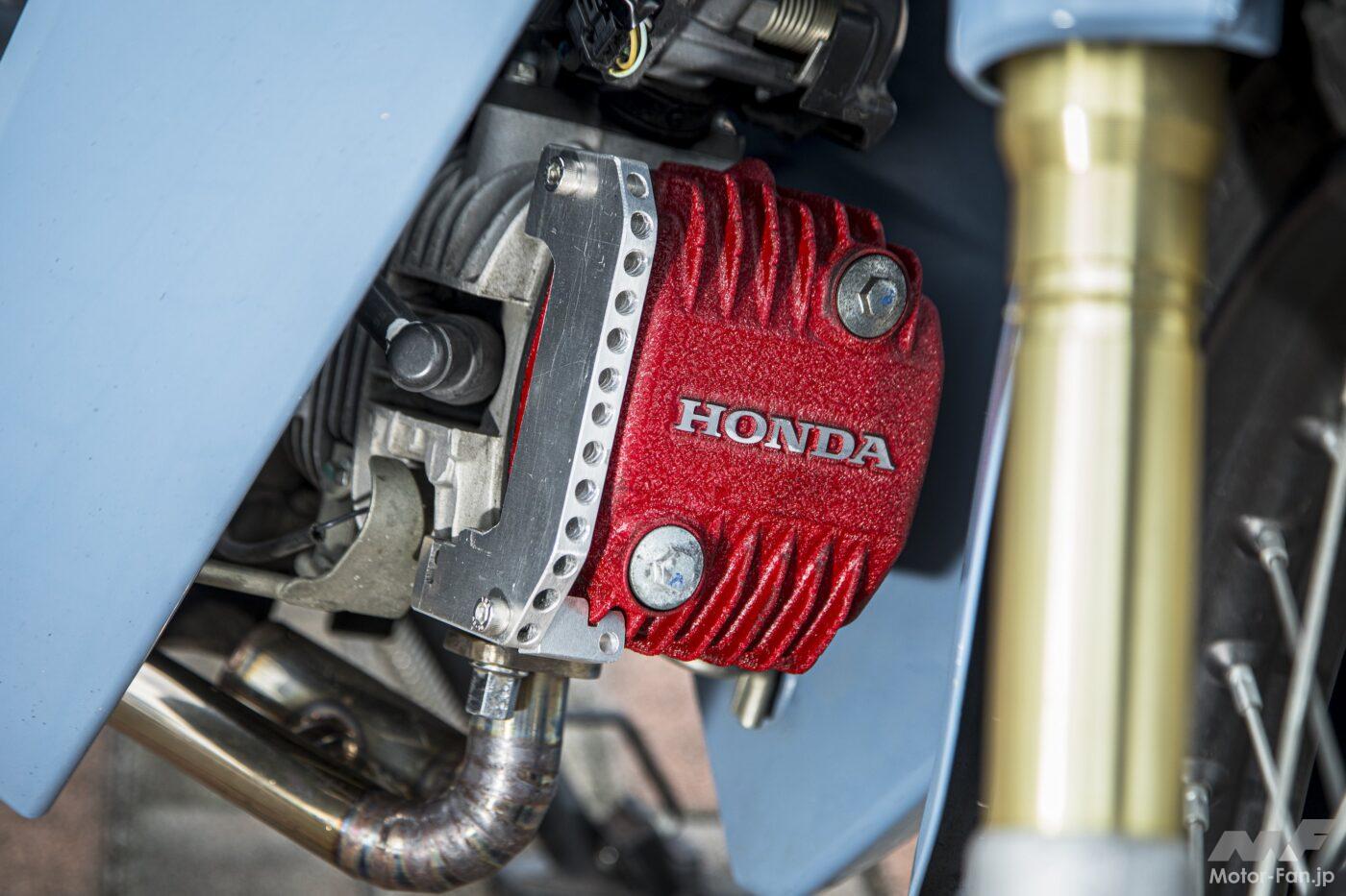 エンジン自体はJA10E型をそのまま使うが、ヘッドカバーを赤く塗装したあたり何かを主張している。ヘッド左に装着しているのはアルミから自作した冷却アップのためのパーツ。また輪切りにして溶接することで独自の形状を生み出したエキパイももちろん自作。その奥にサブチャンバーが装着されていて、高回転だけでなく低中速域でのトルクアップに貢献している。