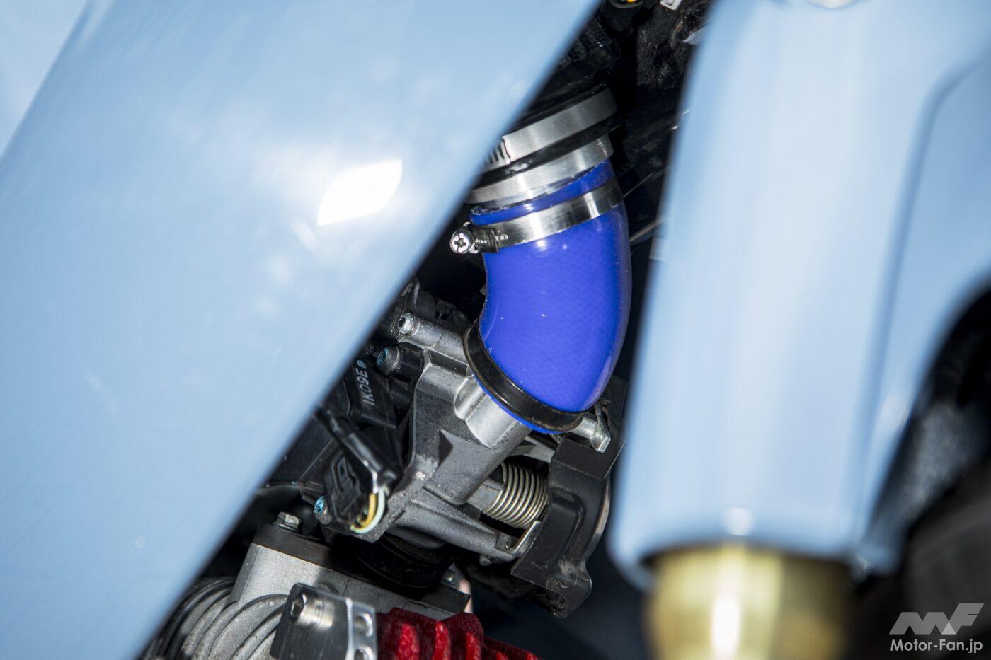 インテークの青いホースがカスタムチックだが、実はスロットルボディは純正を加工して径を拡大した自作ビッグスロットルボディなのだ。より多くの空気を吸い込ませることが可能になり、JA10の記事でも紹介したようにECUに細工をしてガソリンの噴射量を変更している。排気量を変えなくても十分過ぎるほどパワフルになるのだ。