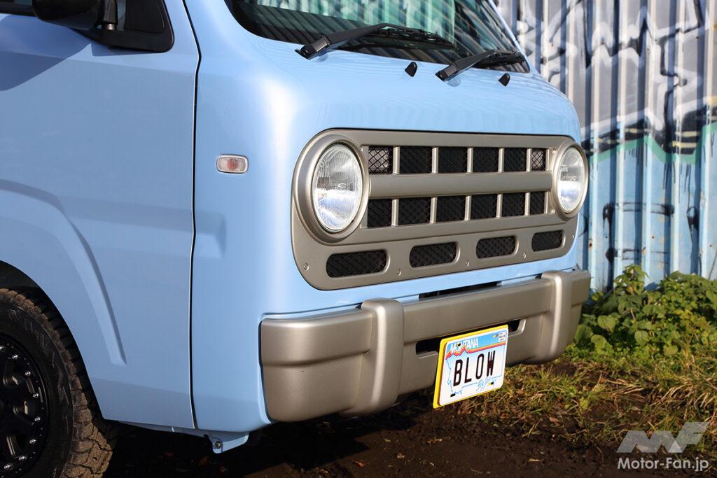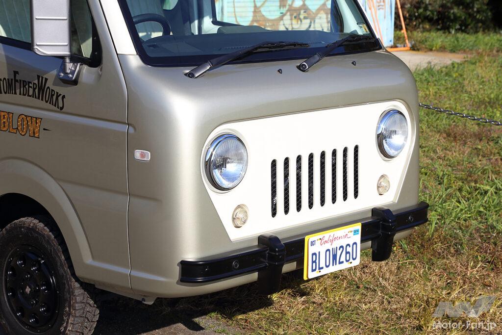 大きなヘッドライトが少々主張強めなキャリイトラックを、クラシカルなジープのピックアップトラックルックに変貌させるウーキーライダー。丸型のヘッドライトとウインカー、そして8本のルーバーで構成されたフロントマスクは非常にスッキリ。真正面から見たらキャリイトラックの面影は皆無。長年フェイスチェンジカスタムに携わってきたブローだけに、完成度の高さは非の打ちどころなし。