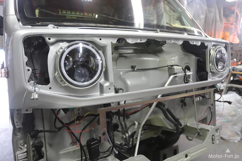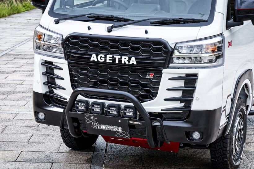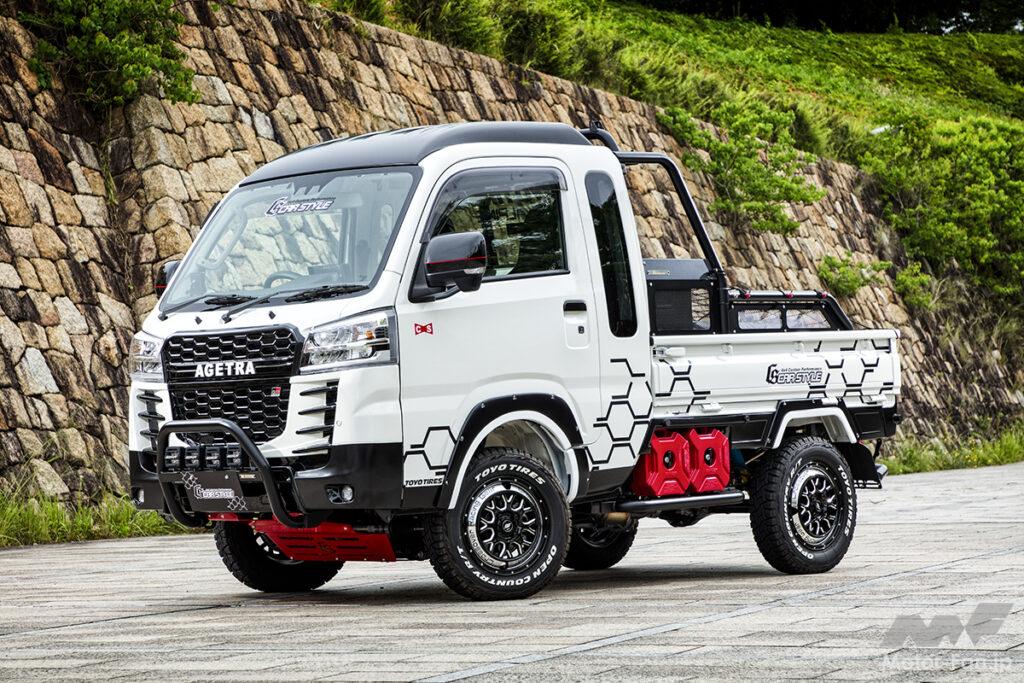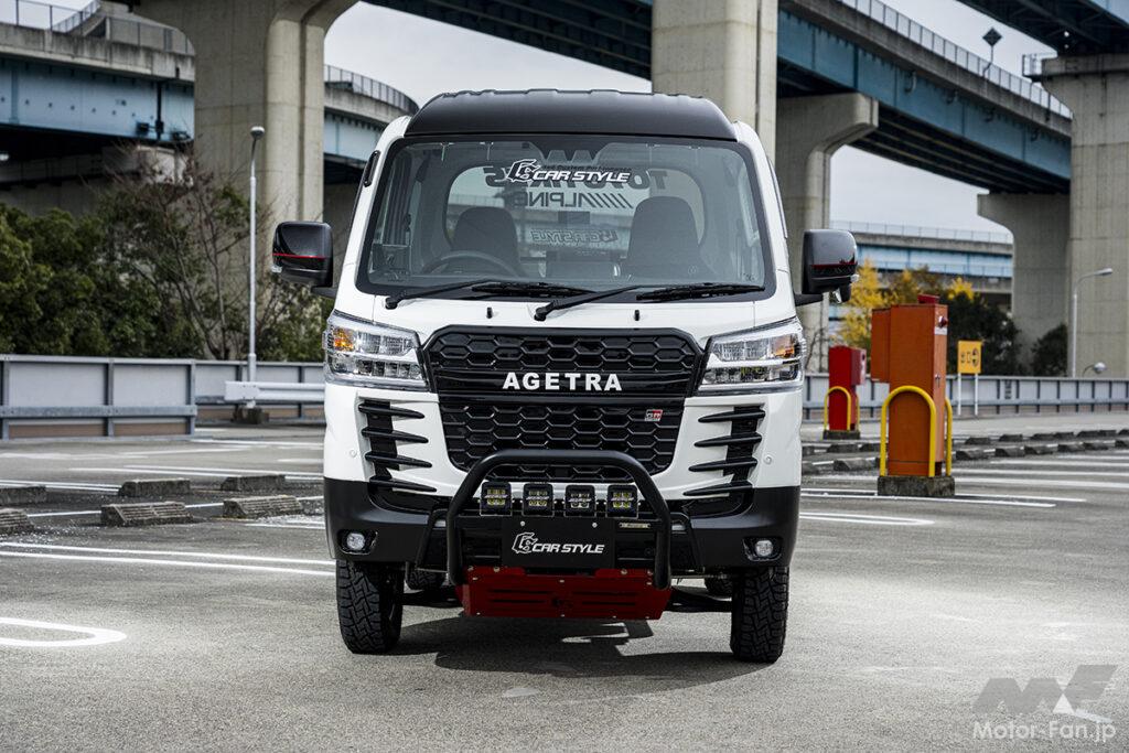 軽トラのリフトアップカスタム「アゲトラ」を提唱するカースタイルは、ハイゼットトラックを強靭なオフロードスタイルへと昇華させるフロントバンパーをリリース。デザインのモチーフは道路状況が過酷な海外でもニーズがあるランドクルーザー300。その中でもアグレッシブなスポーツグレードであるGRスポーツにスポットを当て、ハニカムメッシュ形状の大型フロントグリルを採用してリアリティを追求。デモカーのようにホワイトのボディに対してブラックで塗り分けするなど、実車と同様のカラーコーデで決めるとバンパーの良さが生きる。