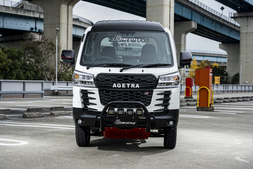外装 【8万8000円〜】トレードマークはハニカムメッシュの大型グリル! ダイハツ・ハイゼットを『GRスポーツ』テイストに【写真・2枚目】 グリルに取り付けたホワイトのアゲトラエンブレムは別売で設定あり。なお同社のフロントバンパーガードタイプ1&タイプ2(写真はタイプ1)を追加で装着することで、ナンバープレートの取り付けが可能となる。 フロントバンパーは後期用に加え、前期用もラインアップ。年式を問わず装着できるのが嬉しいポイント。カースタイルではバンパー以外にもサイドステップやリフトアップキットなど、アゲトラに最適なアイテムが豊富に揃う。 グリル部分は上下2分割とすることで面積を稼ぎ、押し出し感あふれる表情を実現。ライトの下にはランクル300の特徴である4本のフィンをあしらい、攻撃的な雰囲気を醸し出す。フォグランプは純正をそのまま使える。 他車種でも展開しているGRスポーツに相応しいエクステリアパーツを設定。足まわりも専用チューニングを施して走りを強化した。 この画像の記事を読む