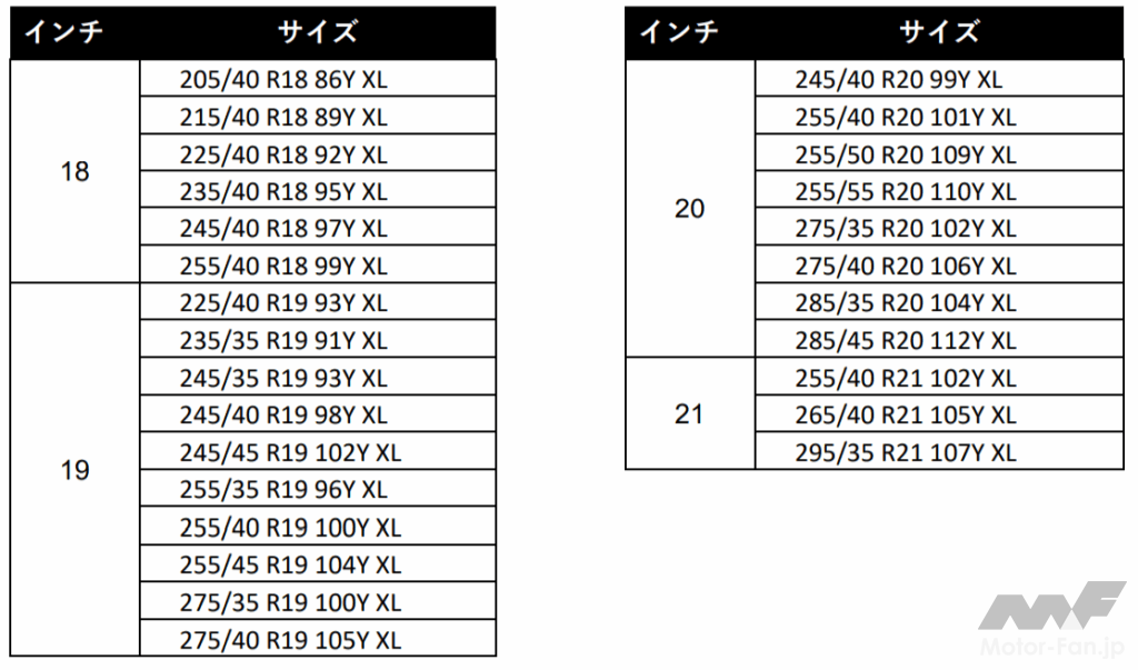 2025年10月から順次発売される「クロスクライメート3スポーツ」。発表時のサイズは、18〜21インチ。タイヤ幅は205〜295、扁平率は35〜55となっている。欧州での装着ニーズの高いサイズ展開からスタートしている。前作の「クロスクライメート 2 SUV」は、17インチも用意しているため、今後のサイズ追加も期待される。