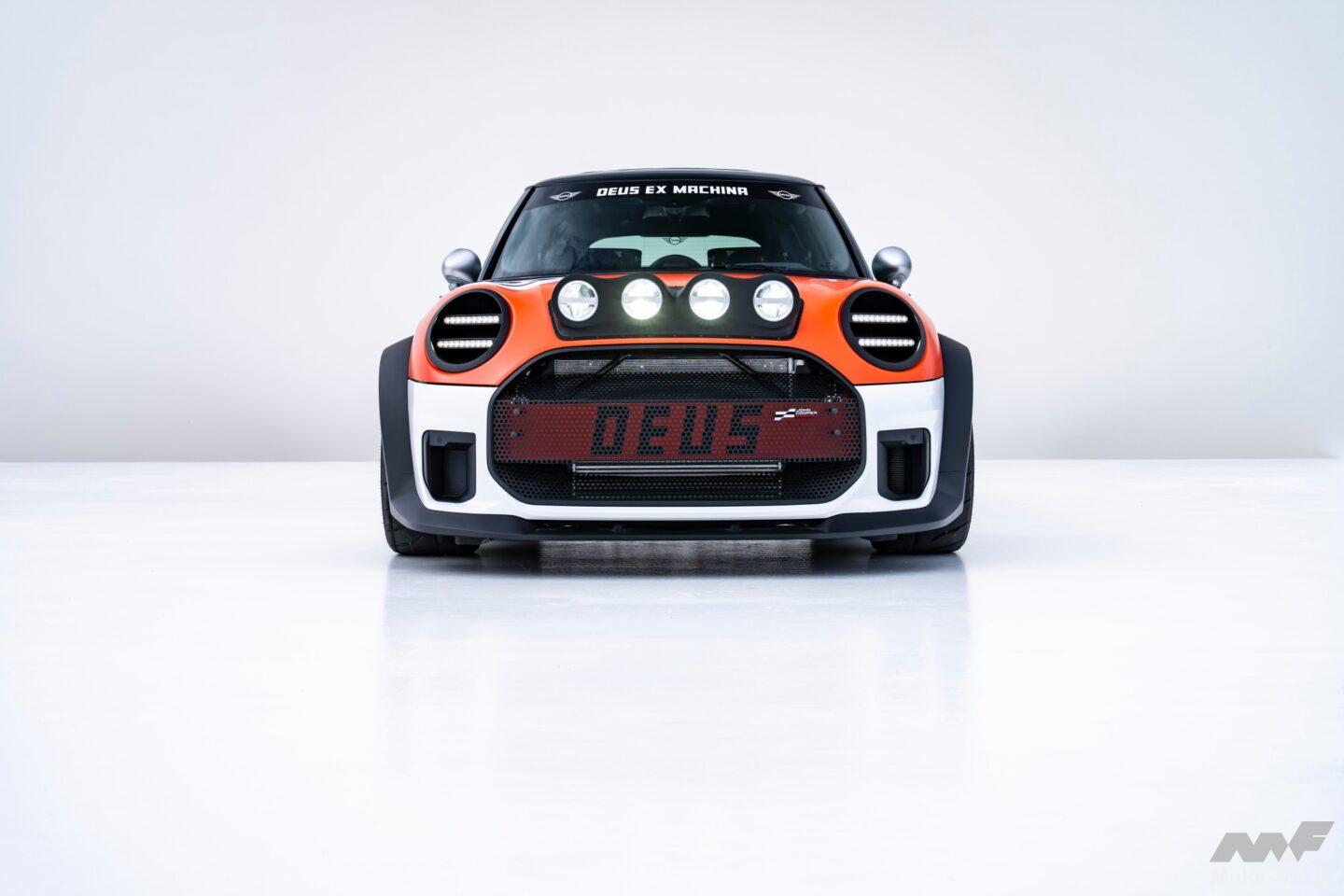 2台のコンセプトカーはともにMINI JCWをベース車両にしている。1台目は最大190kW/258PSの電動MINI JCW、2台目は170kW/231PSの内燃機関搭載MINI JCWモデルだ。各車両のルーフには大きな白い「X」が配置され、MINI JCWとDEUSによる共同創造プロセスが表現されている。