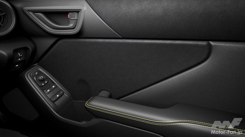 内装では、外板色に合わせたイエローステッチ(ステアリングホイール、シフトブーツ、パーキングブレーキレバー&ブーツ、フロントシート、ドアアームレスト)や、専用の刺繍が随所に施されている。