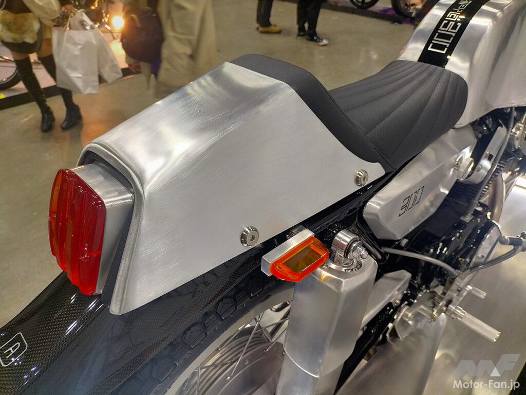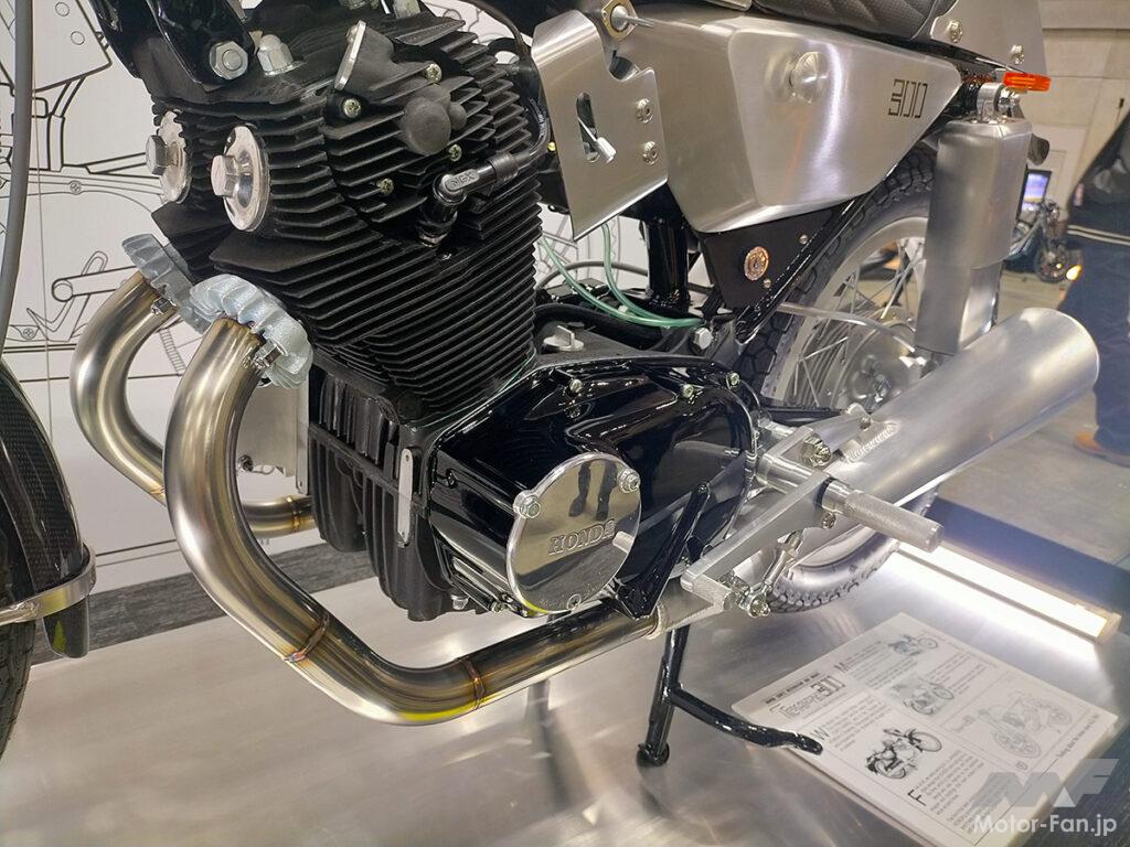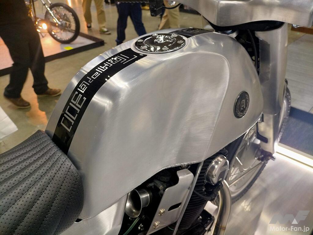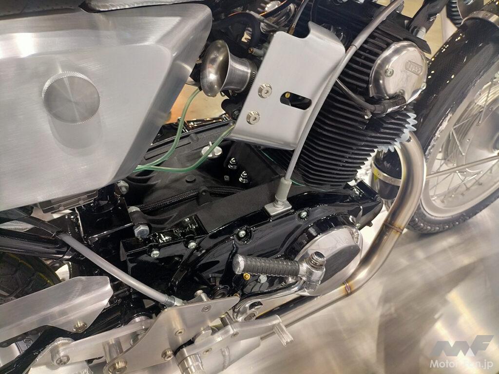 「ドリームCBM72」をイメージしたその外観は、ビンテージ感を押し出したデザインのワンオフアルミパーツ群でドレスアップ。ガソリンタンク、LEDヘッドランプケース、ハンドルカバー、フロントフォークカバー、サイドカバー、シートカウル、サイドカバー、キャブレターガード、リアショックカバー、チェーンカバー。また2本出しダウンマフラーのサイレンサー部もアルミでドレスアップ。