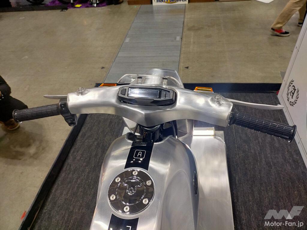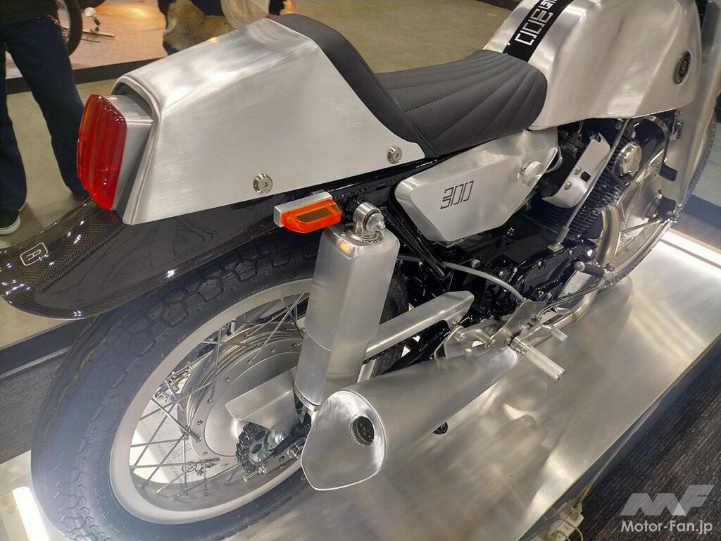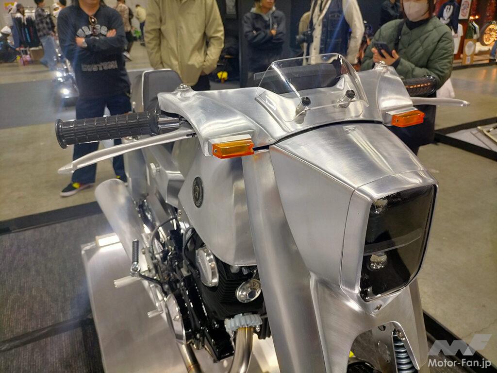 2本のエキパイが伸びるツインエンジンは、腰上&腰下ともノーマルのシルバーからブラックアウト化して、シルバー×ブラックのツートンカラー感を増幅。ハンドルカバーに装着された薄型ウインカーや透明のミニメーターカバー、カーボン製の前後フェンダーなど、細部にアクセントを効かせているのも見逃がせないところ。