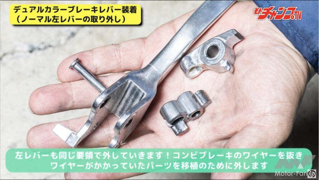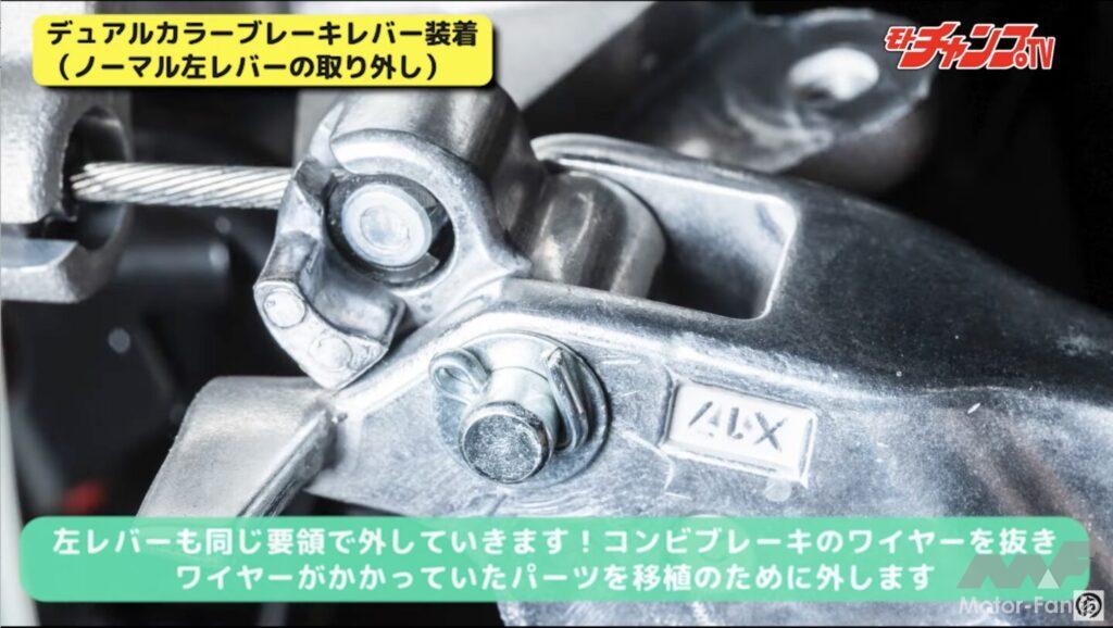 次はブレーキレバーをカラフルなKOSO製に変更してみよう。レバーを交換した経験があれば問題なく作業できるが、初心者の場合は注意が必要。レバーを固定しているボルトは抜け防止のナットを外してからでないと引き抜けない。また右レバーにはスプリングが使われていてレバーを外した途端に飛んでしまい紛失する可能性もある。注意しながら作業していただきたい。