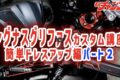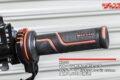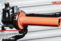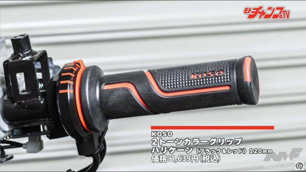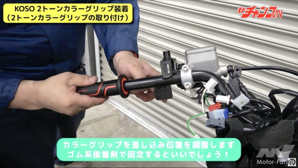 せっかくハイスロにしたのだからグリップにもこだわりたい。今回はカラフルかつデザインの良いKOSO製2トーンカラーグリップに変更している。右グリップは装着したハイスロにパーツクリーナーを吹きかけて取り付けるだけで済むが、左グリップは純正を取り外すためカッターでカットしないといけない。再利用はできなくなるが、純正は接着剤で固定されているため不可避なのだ。またカッターで切る時はマイナスドライバーでグリップとハンドルの間に隙間を作り、ハンドル本体に傷がつかないよう浅めにカットしよう。