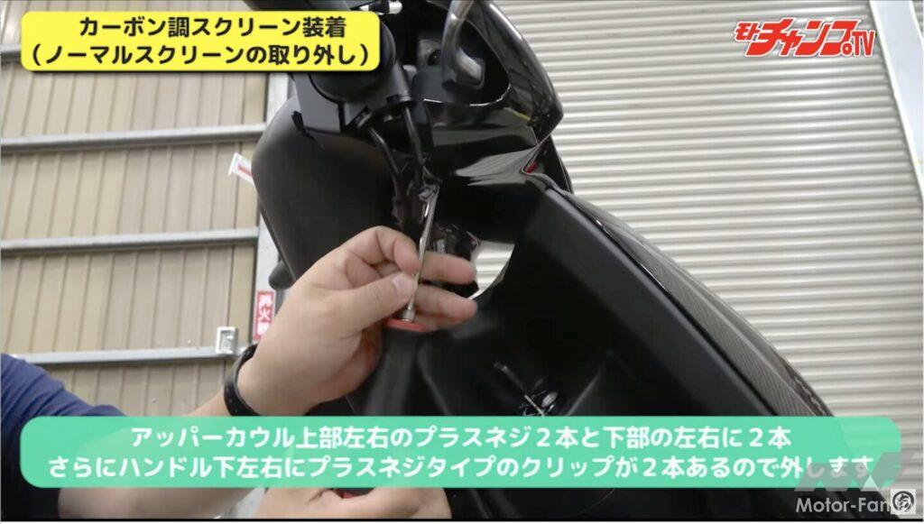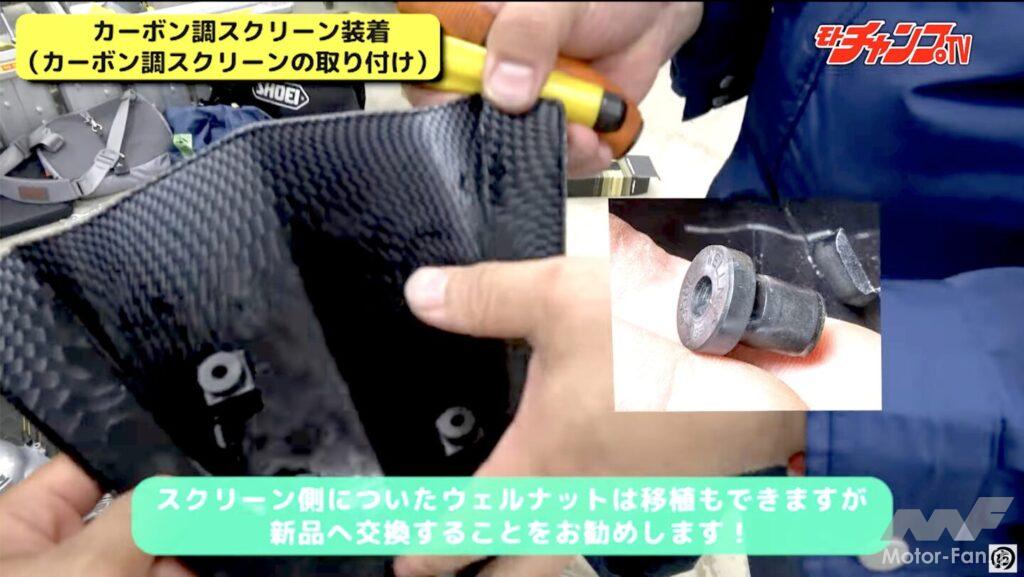 まず紹介するのはカーボン調スクリーン。簡単そうに見えるがアッパーカウルを外さないと取り付けられないため手間数が多い。だが、手数が多いだけでプラスドライバーさえあれば誰でもできるため、ぜひチャレンジしていただきたい。