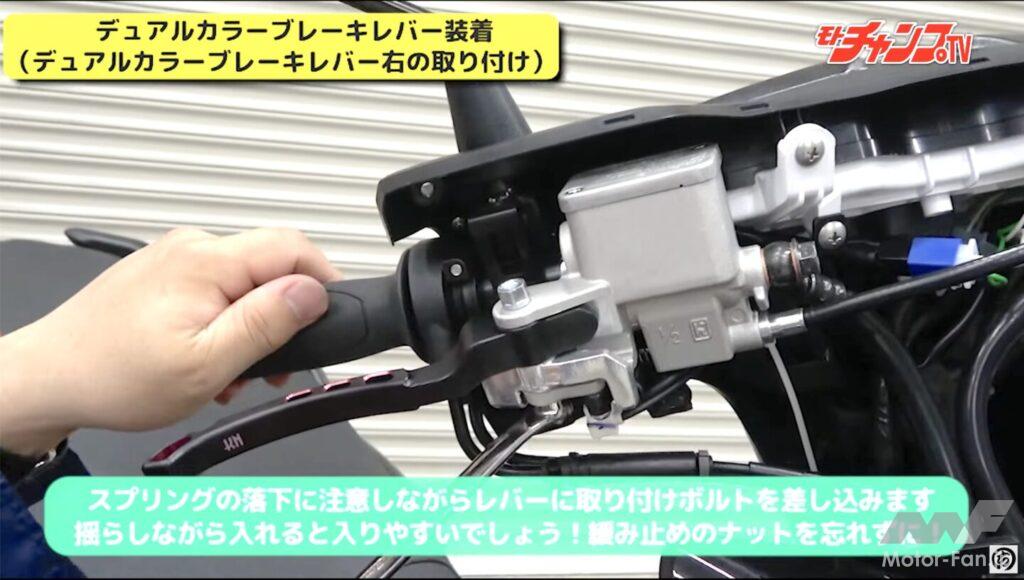 次はブレーキレバーをカラフルなKOSO製に変更してみよう。レバーを交換した経験があれば問題なく作業できるが、初心者の場合は注意が必要。レバーを固定しているボルトは抜け防止のナットを外してからでないと引き抜けない。また右レバーにはスプリングが使われていてレバーを外した途端に飛んでしまい紛失する可能性もある。注意しながら作業していただきたい。