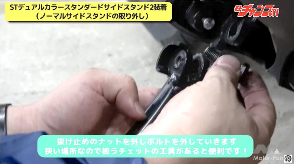 センターより使用頻度が高いサイドスタンドは嫌でも目につくポイント。純正は黒一色で味気ないから、STデュアルカラースタンダードサイドスタンド2に変更するとグッとルックスが引き立つ。交換するにはスプリングフックが欠かせず、マイナスドライバーなどでこじるとトラブルの元になる。またスタンドは裏からボルトを外すため、板ラチェットなど厚みのない工具も欠かせない。作業時はセンタースタンドを使うようにする。