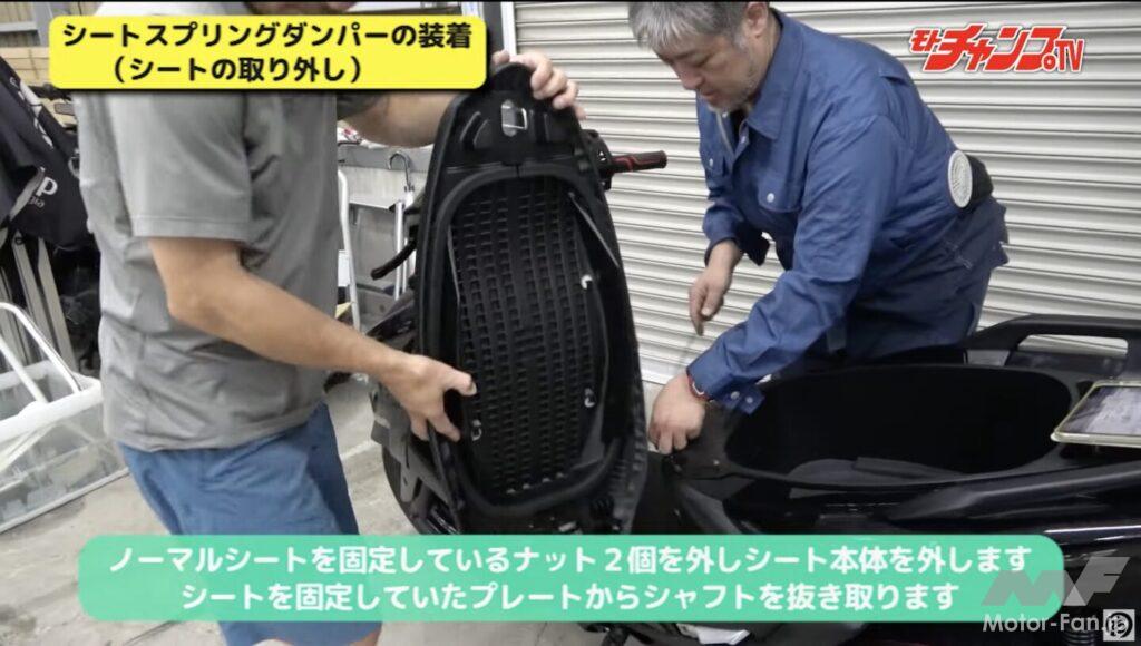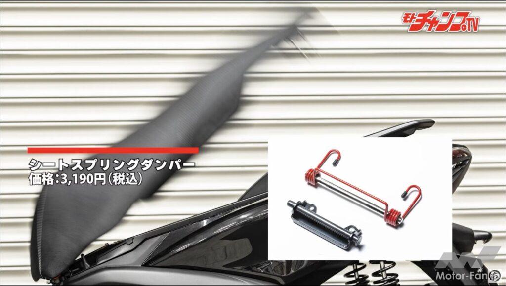 ロックを外してもシートは手で持ち上げないといけない。面倒というほどのものではないが、もしシートが勝手に跳ね上がってくれたらと思うユーザーも多いことだろう。KOSO製シートスプリングダンパーを組み込むことで実現するので、シート下の利用が多いならぜひ装着を考えてみよう。ただし、シート裏の突起を一部カットしなければならないので、よく考えてから購入してほしい。