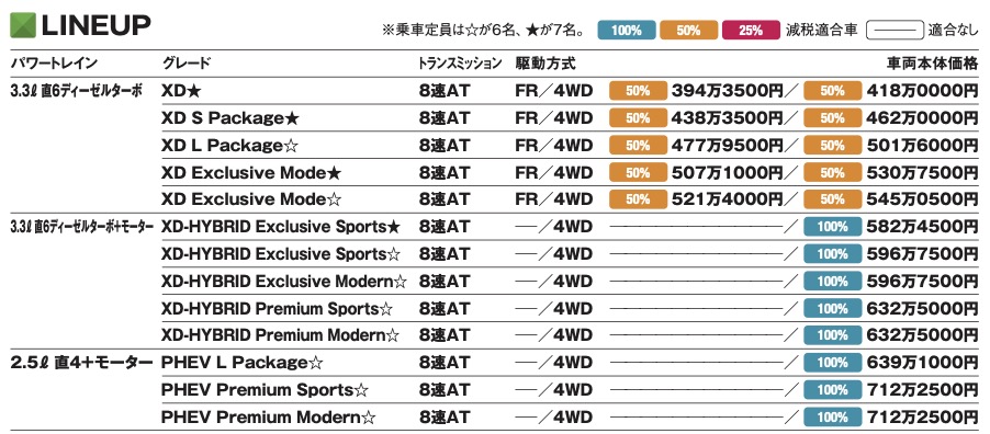 第一弾商品のCX-60とハードウエアの多くを共有していてラインナップは3.3ℓ直列6気筒ディーゼルの「XD」、それに48V MHEVを組み合わせた「XD-HYBRID」、2.5ℓ直列4気筒+強力モーターのPHEVと基本は3種類。装備や仕様が豊富に用意され、全18グレードとなる。