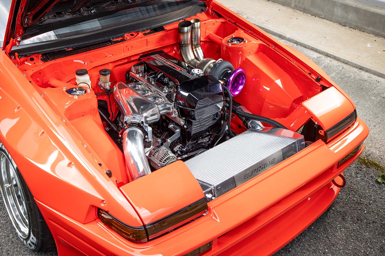 さらに、ボルトオンでは面白くないと自らエキマニを製作し、600psを想定するHKSのGT5565-BBタービンを装着。タービンハウジングとウエストゲートからニョキっと突き出るエキゾーストパイプ、インタークーラーとラジエターを水平にマウントする独自のレイアウトも構築していった。