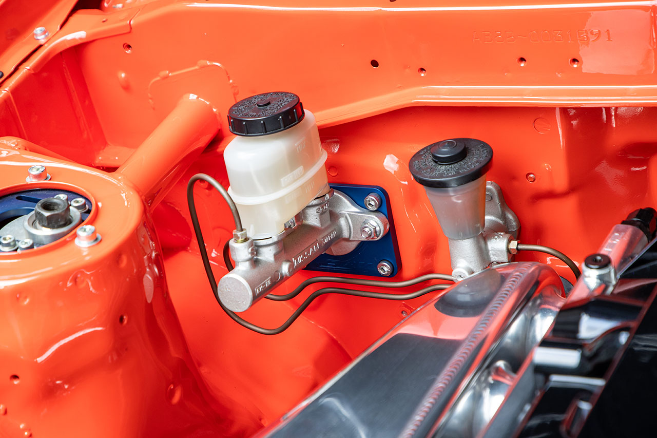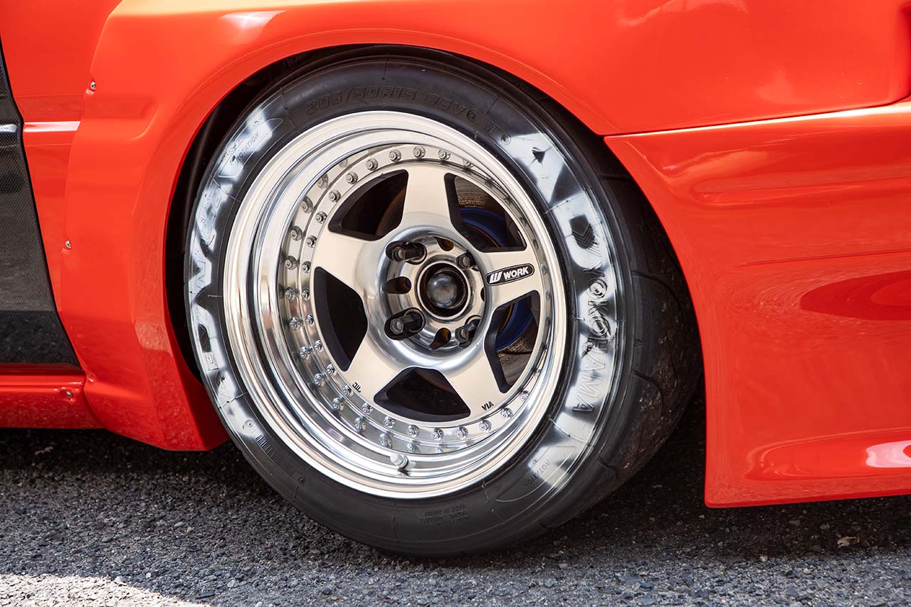 ホイールはワークのマイスターCR01。ワイドフェンダーに合わせたサイズ選定を行い、フロントが9.5Jマイナス9×15、リヤが9.5Jマイナス40×15という深リムを実現している。タイヤはアドバンA050。ブレーキはエンドレスのキャリパーを特注色で仕上げ、旧車っぽい雰囲気を出した。
