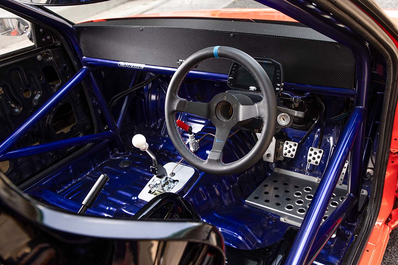 カーボン製のダッシュボードを備え、不要な物はごっそりと排除したレーシーなインテリア。ステアリングはアメリカのレナウン製を採用している。同じくアメリカのJSPがリリースしているビレット削り出しのシフターを備え、アルテッツァ用6速MTのシフト位置を最適化。その前方には前後ブレーキのバランサーも装備する。