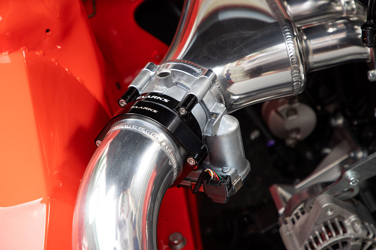サージタンクはオーストラリアのウェルドスピード製で、TAARKSのアダプターを使って電スロを装着。アクセルペダルは日産の純正品を流用している。水平にマウントしたインタークーラーはセトラブ、その下にあるラジエターはトラストだ。