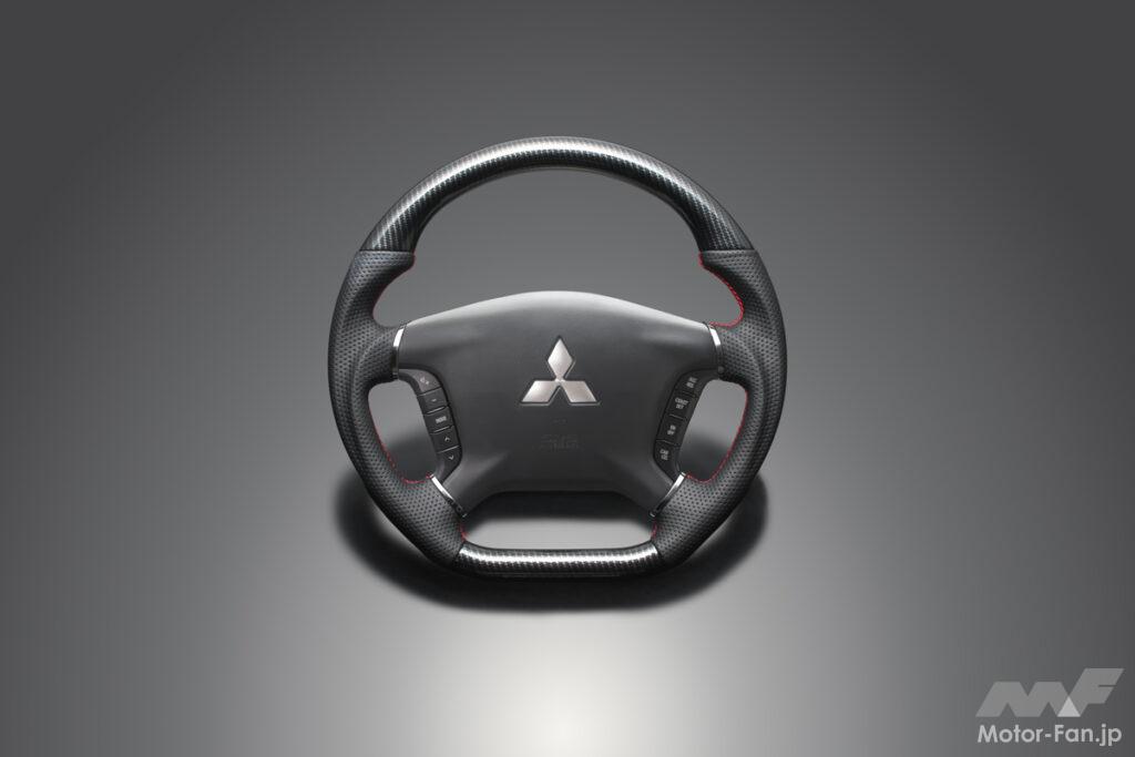 今回、新たにデリカD:5用のステアリングを設定。純正交換タイプで、スイッチやエアバッグなどは移設流用。違和感のない仕上がりが、まずポイント高めだ。最大の見せ場はデザイン性。握りやすくスタイリッシュなガングリップを採用。また、円型ではなくスポーティなDシェイプ形状。これだけで、純正とはガラリと雰囲気が変わる。