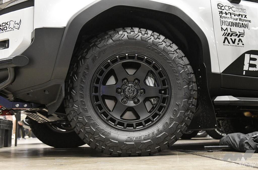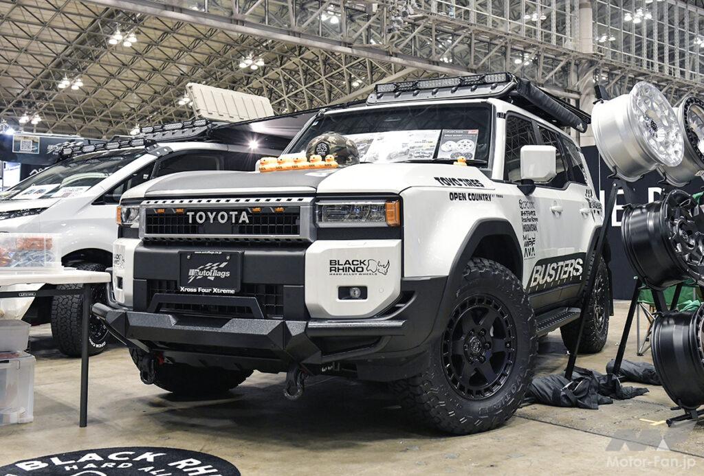 デリカを筆頭とした三菱車のイメージがあるオートフラッグスだが、実はトヨタ車にも積極的! ハイラックスやランドクルーザーも手掛けており、会場にも250を持ち込んでいたのだ。ガード類はまだ開発中とのことで、フルでカスタムできるよう鋭意製作中。今後の期待が高まるアイテムが盛り沢山だ。