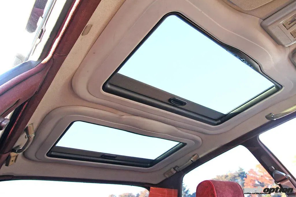 後付けのべバスト製ガラスルーフを前後ツインで装着。車内に開放感をもたらすのはもちろん、どちらもチルトアップ、アウタースライドでのオープンが可能になっている。なっさんいわく、「ただ、ルーフを大きく切ってしまったのでボディ剛性が明らかに落ちてしまったんですよ」とのこと。