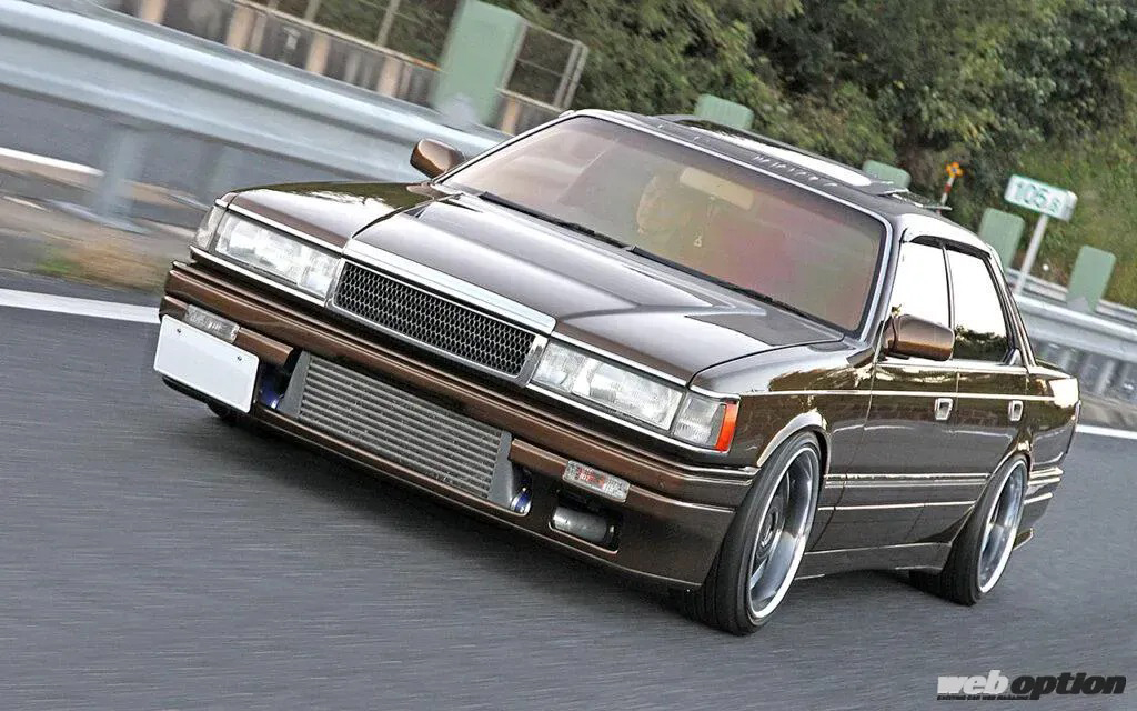 バンパーを大胆にカットして装着されたHPI製汎用インタークーラーが迫力のフロントマスク。エアロキットはユアーズ製で、グランツーリスモ用フロントグリルや他車種用クリアウインカーレンズの装着、フォグランプのクリア化、前後バンパーメッキモールのレス化などによってイメージチェンジが図られている。