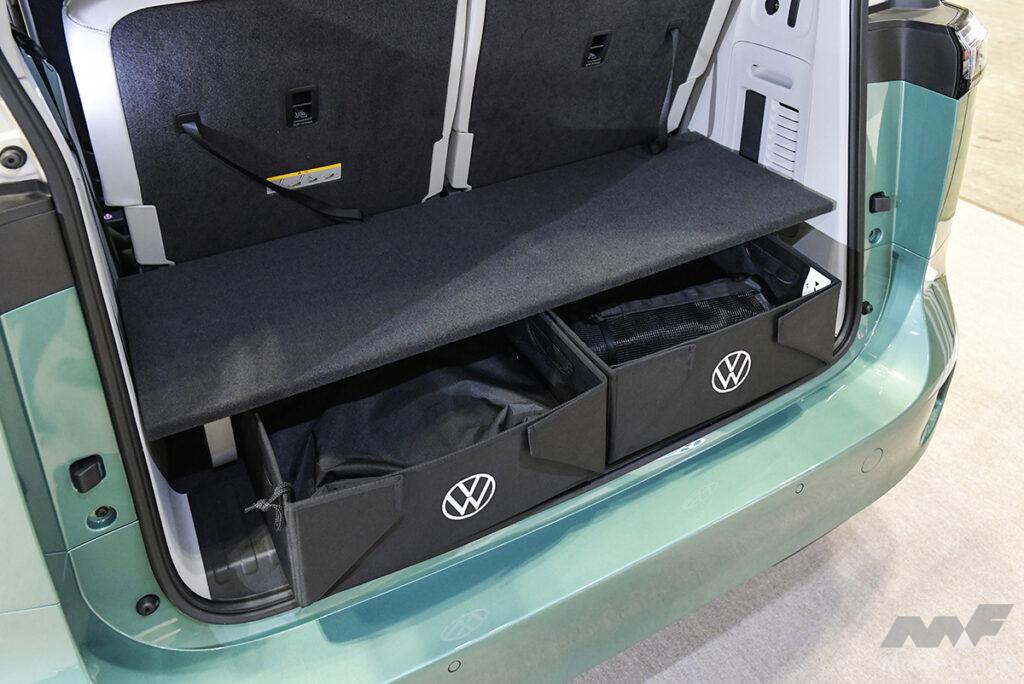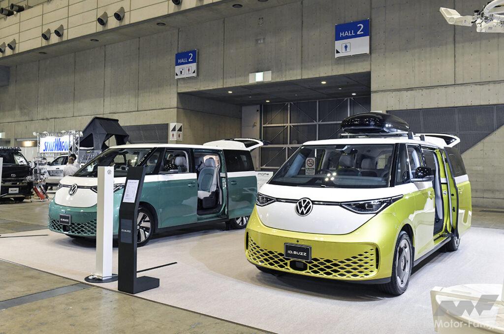 ワーゲンバスと言われるモデルを現代に再現、しかもEVで! ID.Buzzはミニバンなのでアウトドアにも最適。荷室には自在に使えるボードがつき、空間を立体的に有効活用できる。ロングボディ(7人乗り)、標準ボディ(6人乗り)の2種類があり、会場でも注目度は大だ!
