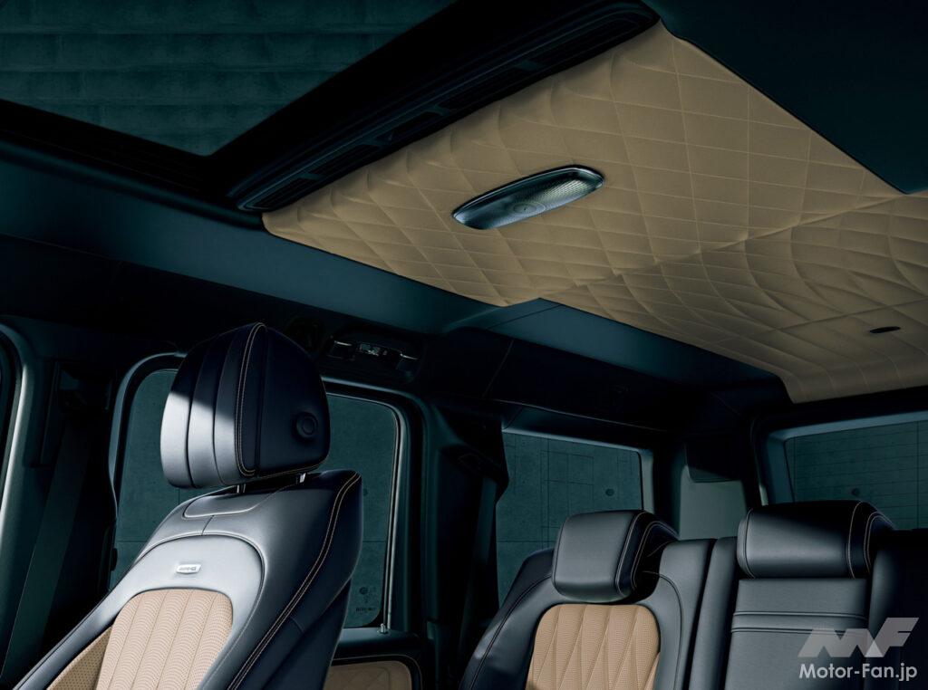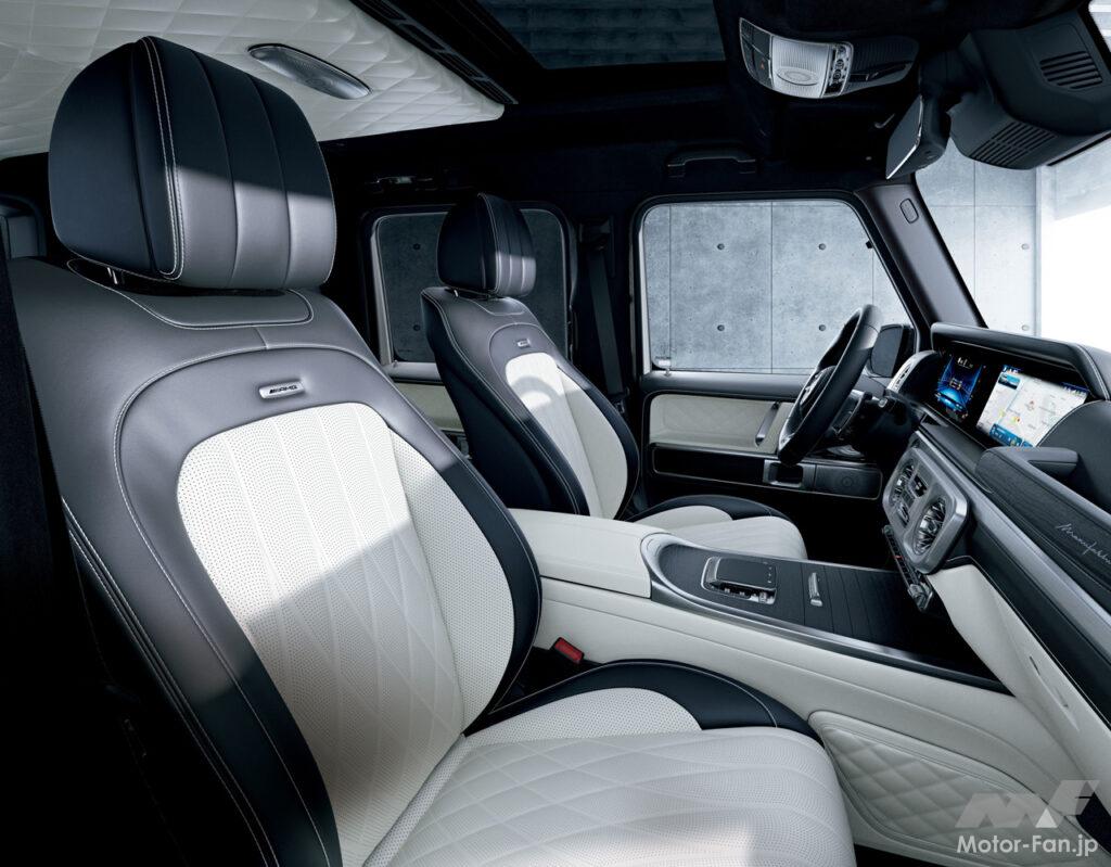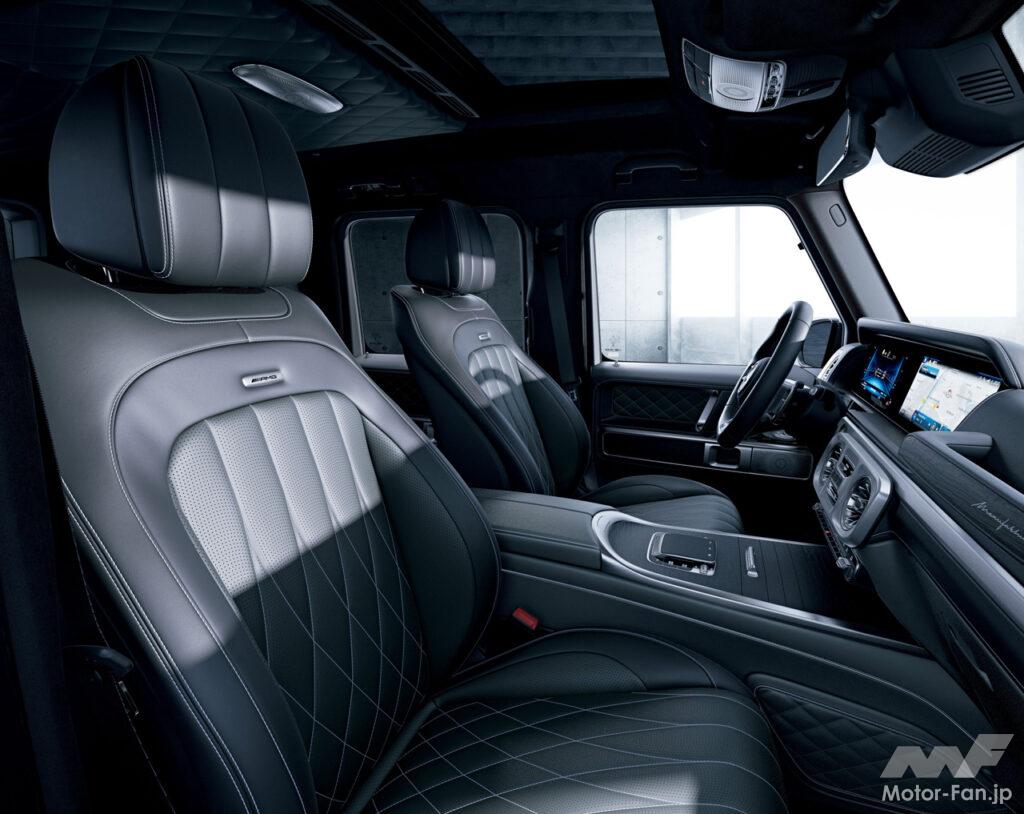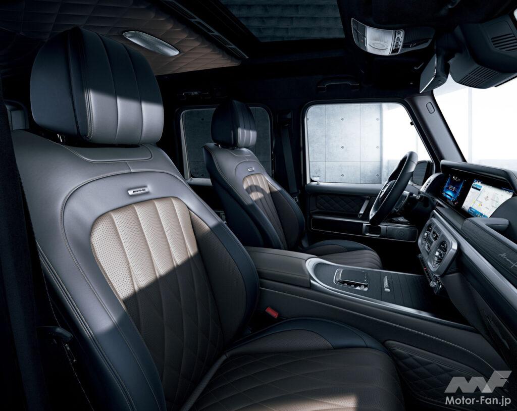 エクステリア同様にブラックアクセントが施されているほか、同モデル限定装備として「マヌファクトゥーア オープンポアブラックアッシュウッドインテリアトリム」や、Gクラスとしては日本初採用となる「マヌファクトゥーア フルレザーパッケージ」に加え、通常モデルでは有償オプションの「マヌファクトゥーア プログラム・プラス」や「マヌファクトゥーア インテリアプラスパッケージ」を採用。限定モデルならではの特別感を高めている。