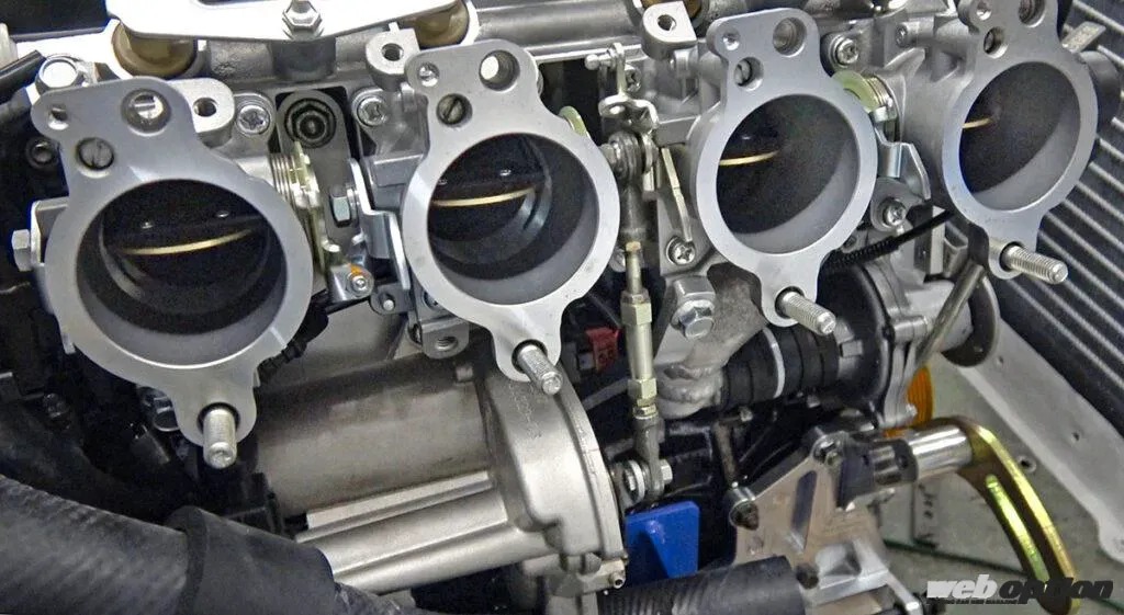 4連スロットルはAE111純正、美しいサージタンクはオーストラリアのウェルドスピード社とのコラボで誕生したビレッドインテークマニホールドキット。見どころはスロットルバルブのコントロールで、BMW純正のモーターを使い、リンケージを介して4連スロットルを電子制御化しているのだ。