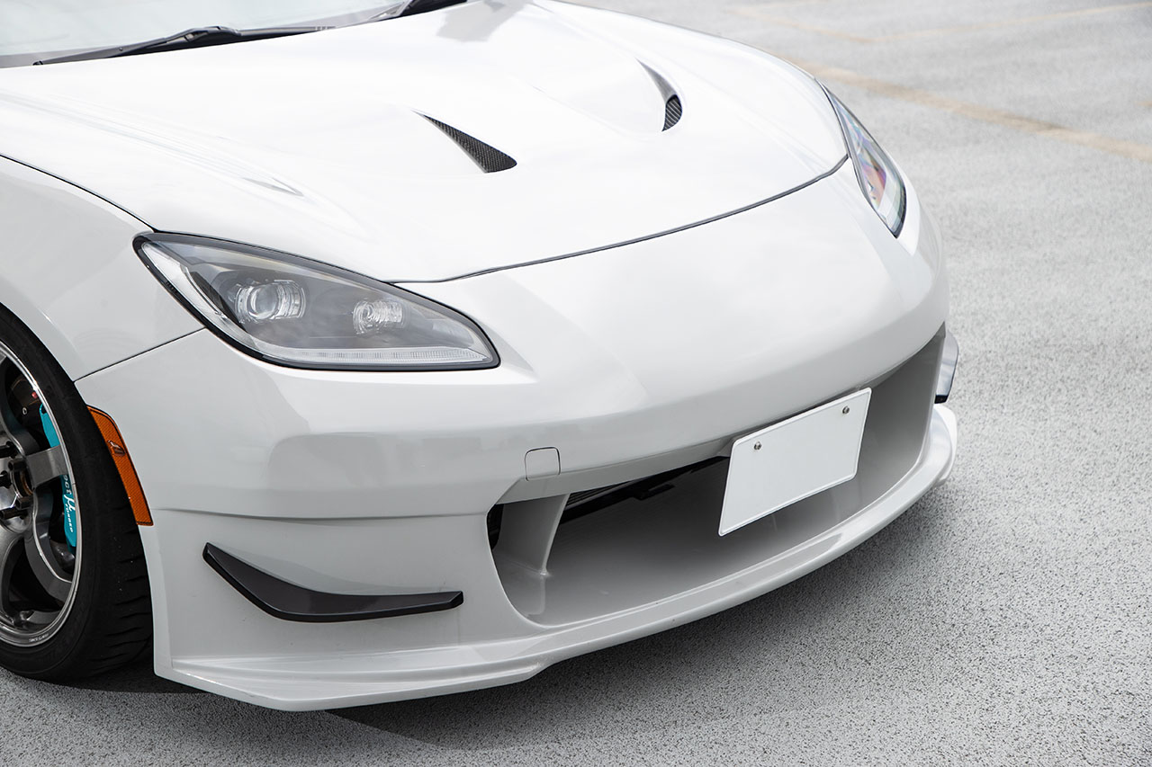 フロントバンパー(10万7800円)は、あえてセンターダクトのみを配置したシンプルなデザインを採用。ダクトだらけの派手なエアロが多い中で、逆にシンプルさを武器に個性を際立たせている。もちろん冷却性能は一切妥協せず、走行風を効率的にラジエターへ導く形状とし、チューニングエンジンにも余裕で対応。