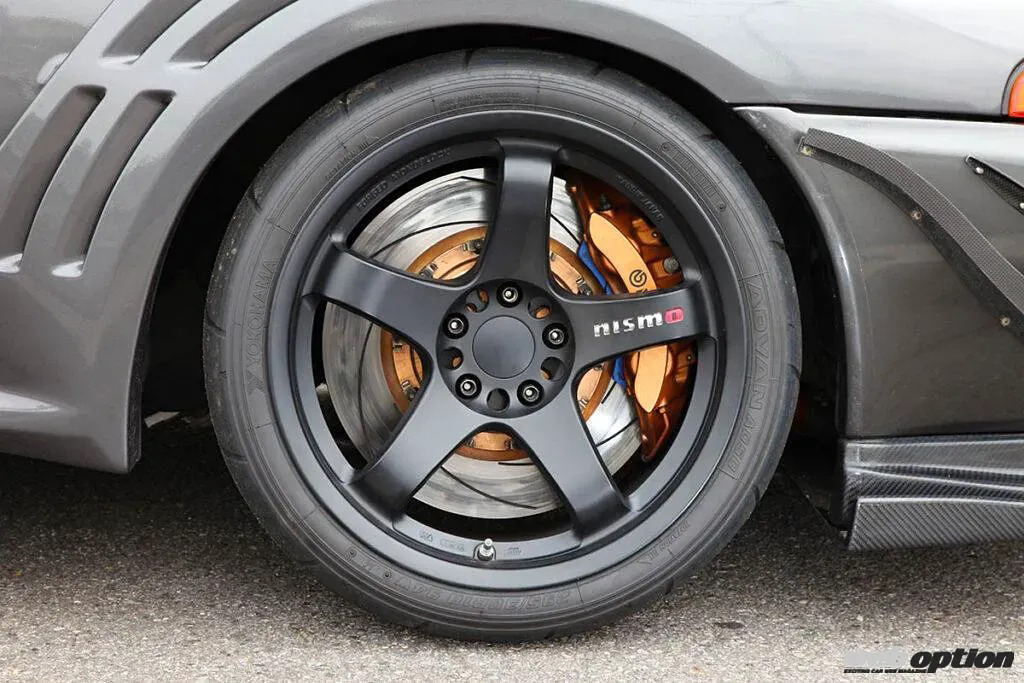 ホイール&タイヤはニスモLMGT4(10.5J+15)に、アドバンA050(295/30R18)という組み合わせ。ブレーキは前後R35純正キャリパーを流用。そこにフロント390φ、リヤ380φのディクセル製2ピースローターを組み合わせ、制動性能を向上させている。